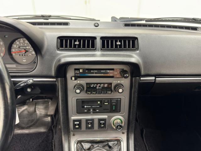 Plenty of thrills, but generally no frills describes most interiors of the 80\'s, and this one mostly follows suit with simple black vinyl door panels with polished trim and stitch patterned inserts, window crank and even some storage in the carpeted kick panel. Attractive and welcoming black bucket seats include vinyl borders around a cloth insert and other than a tear in the driver\'s lower, they are in great shape. Up front, the simple 4 spoke sport steering wheel frames the instrument cluster, three gauges relaying seven bits of information with a row of idiot lights below. In true sports car fashion, the tachometer is front and center. Gray plastic frames the center stack where we have a Clarion AM/FM/Cassette player below it, numerous toggle switches, and the A/C panel up top. This stack cascades down to the center console where the black booted shifter resides along with a change holder for those dreaded tollgate receptacles, and all is clean. Low pile black carpet covers the floor and a black vinyl headliner is up above with a decorative stitched design that runs north to south. The carpeted hatch floor is open and clean and is flanked by molded plastic walls that house integrated speakers.