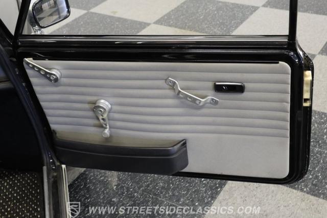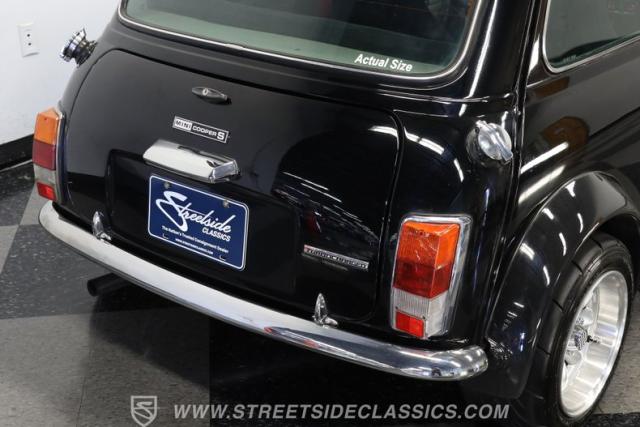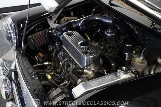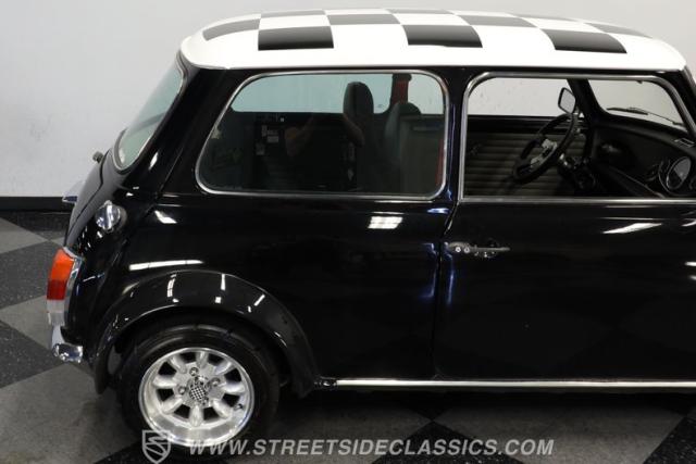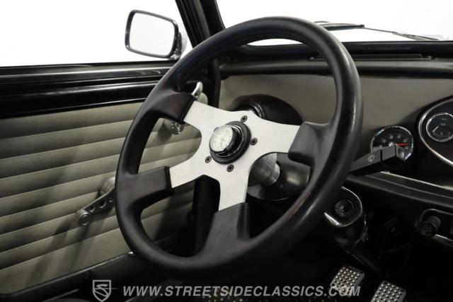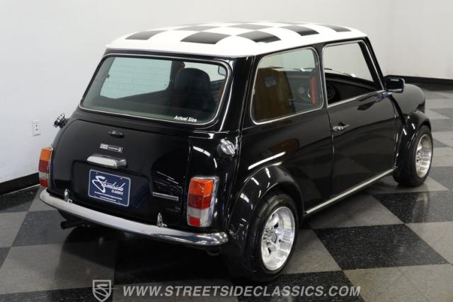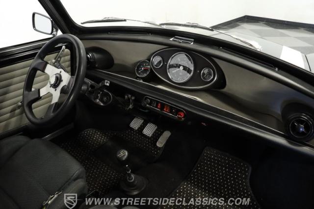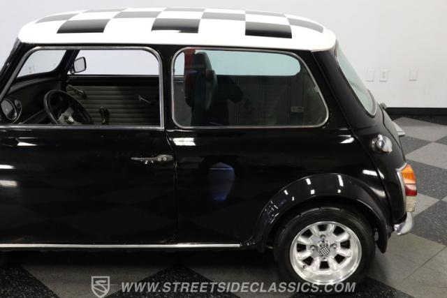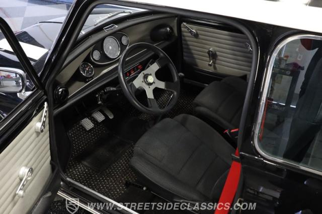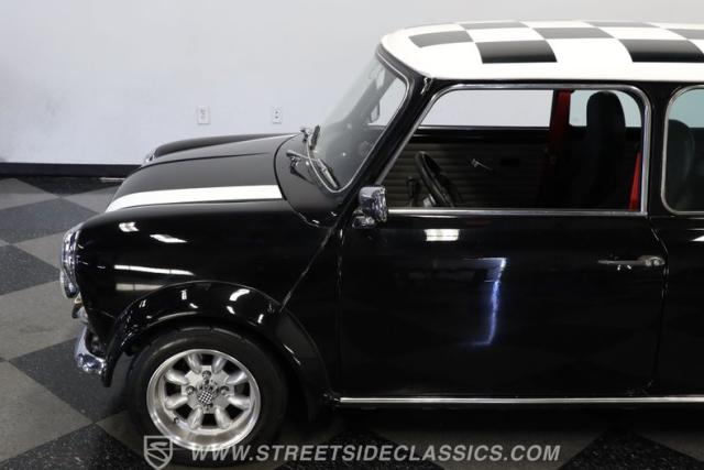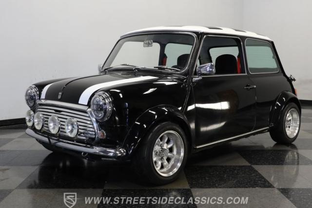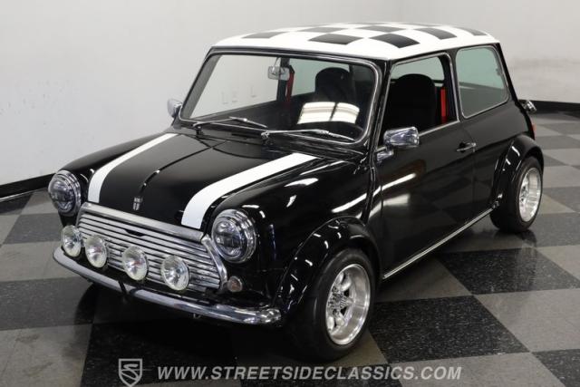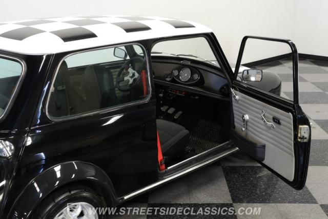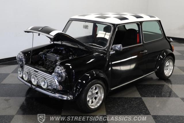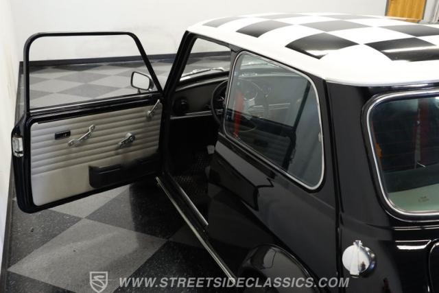 Here we have a 1968 Austin Mini Turbo, a great choice for anyone who doesn\'t want to drive a large vehicle. It\'s compact, easy to maneuver, and economical on fuel. The black paint contrasts nicely with the white checked roof and white stripes, giving this Mini a classic yet sporty appearance. The wheels are in good shape, and all the chrome and brightwork present well. LED headlights have been installed, and four auxiliary lights sit in front of the grille, adding both style and visibility. Overall, this is a well-preserved Mini that would be a blast to drive, especially in a busy city where traffic and tight parking spaces are common.