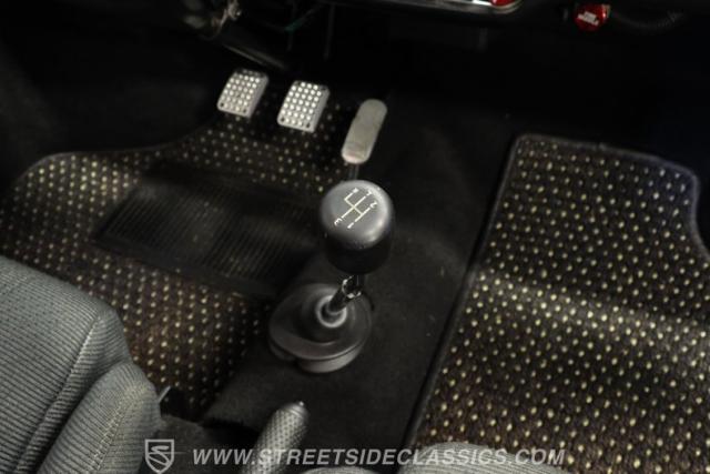 The black interior delivers a small racing-inspired feel. The bucket seats come from a Miata and remain in good condition, offering improved support while driving. The door panels, carpet, and headliner are all in good shape as well. An aftermarket steering wheel has been installed, featuring a quartz clock mounted in the center where the horn would typically be located. Behind the wheel sits a set of aftermarket Smiths gauges in the cluster, along with an added Smiths tachometer. The shifter and parking brake are mounted on the floor in the center. All the glass is in good condition, and while space is limited, there is a small carpeted trunk area for light cargo.
