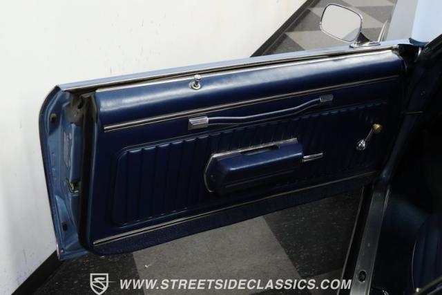 Marking the inaugural year of production, this 1970 Chevrolet Monte Carlo presents itself in factory-applied Astro Blue. The sweeping lines and classic proportions create a distinguished look, complemented by a dark blue vinyl top for a premium dual-tone effect. Chrome bumpers retain an impressive luster while framing the body\'s elegant curves. Fifteen-inch GM Rally wheels fill the wheel wells perfectly, wearing 225/70R15 tires with substantial tread depth. Every exterior detail aligns with Chevrolet\'s vision of affordable luxury from the early seventies.