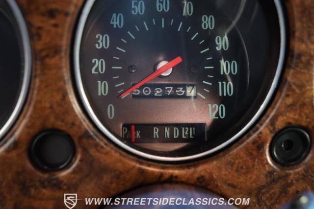 Opening the doors reveals a factory-correct dark blue interior featuring plush knit cloth on the split-bench seats. The door panels match perfectly with the seats, while the dash presents clear, legible gauges framed by gleaming faux wood accents. The column-mounted shifter keeps the cabin layout clean and uncluttered. Additional interior amenities include functioning air conditioning, an AM radio for period-correct audio, and complete front and rear seatbelts. The trunk area maintains excellent condition with factory mat, spare tire, and jack present.