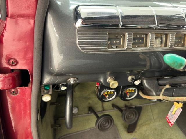 Gray and small checked white broadcloth upholstery covers the sprawling super comfortable front split back bench seat and twins itself on the rear bench that stretches from B pillar to B pillar. The same motif is incorporated into the doors mid panels with plain gray uppers and lower strip of lime green carpeting. All this is with a peppering of chrome for the door releases, window cranks, and vent window latches. A large black steering wheel presents with a restored and polished to the nines chrome horn ring with the FORD logo emblazoned in the center. This wheel fronts an art deco style metal dash, peppered with ribbed chrome and machined aluminum knobs. Round gauges house a gold number accented speedometer and gold numbered clock. 4 rectangular gauges also front the wheel and monitor vital engine functions. Just below the dash are a set of dual aftermarket gauges. A modern heater/Vintage AC system is mounted under the dash for cool cruises and an AM/FM/Cassette player is now mounted in the dash. Lime green carpet floods the floors showing nary a mark and is topped with gray carpeted floor mats and a light gray cloth headliner hangs tightly above. A shout out to the trunk which follows suit with flawless lime green and gray carpeting.