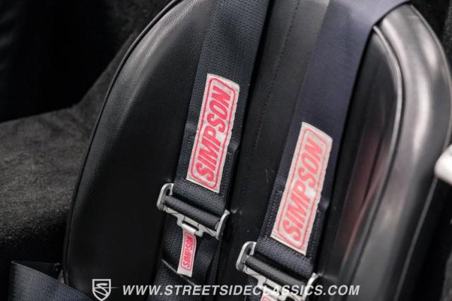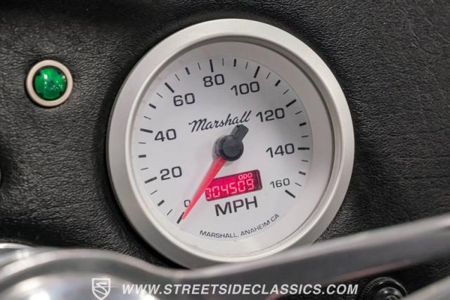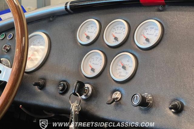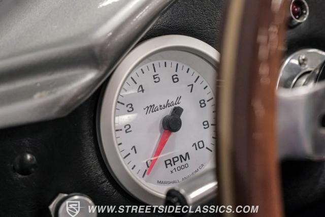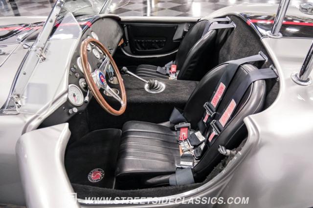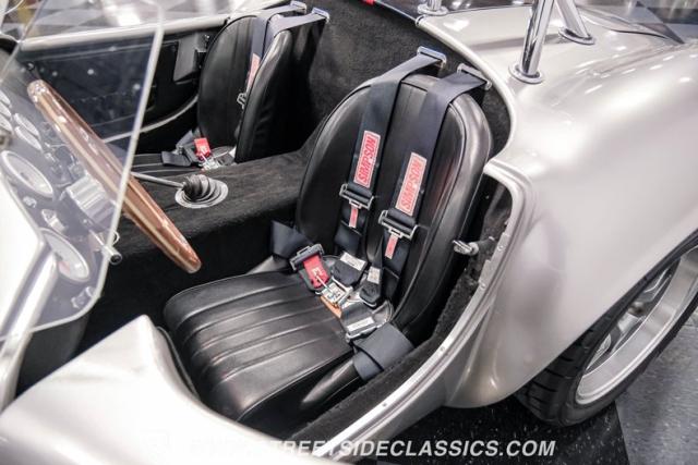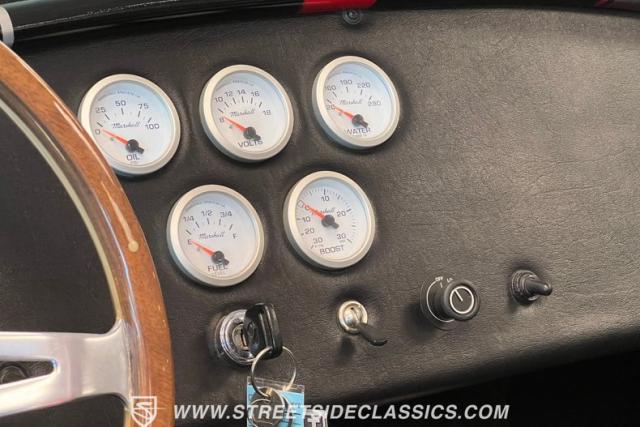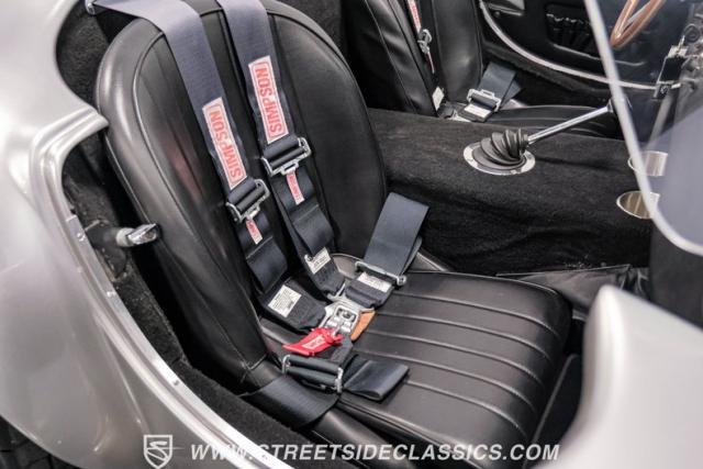 Black vinyl adorns the purposeful interior. Bucket seats, equipped with Simpson harnesses, lock occupants in place for high-performance driving. A wood-rimmed steering wheel offers a tactile connection to the road, while Marshall instruments relay vital information clearly. Unlike many stripped-down Cobras, this build includes unexpected amenities like functional heat and cup holders, adding practicality to its performance pedigree.