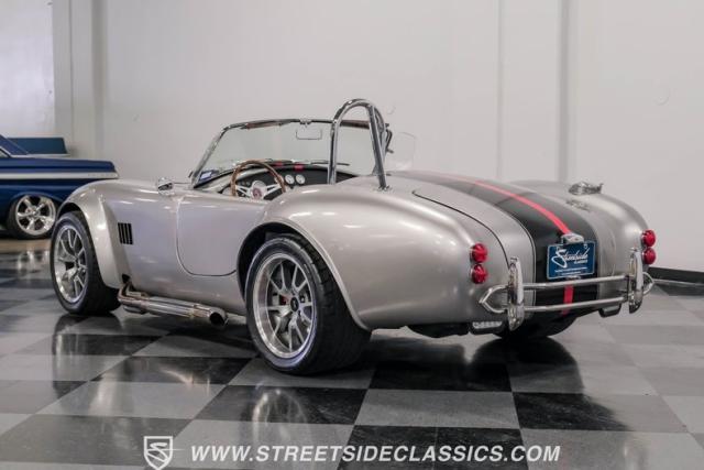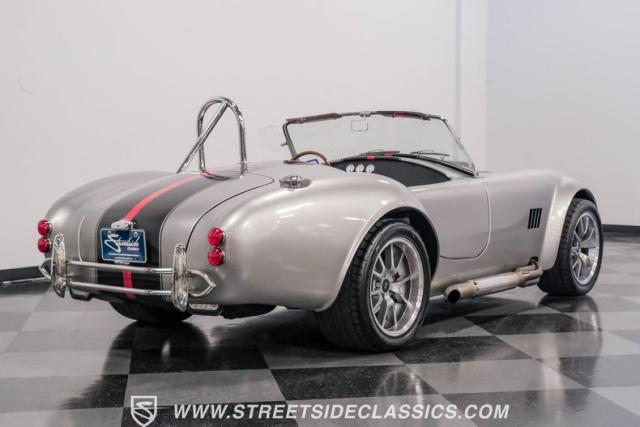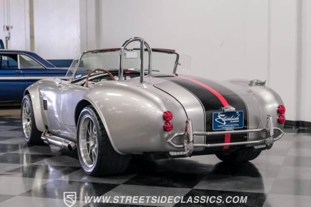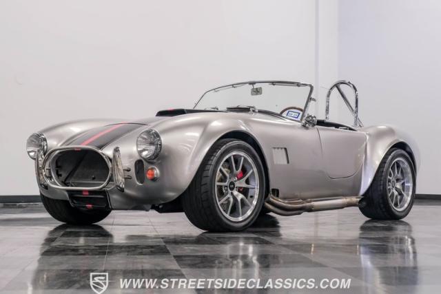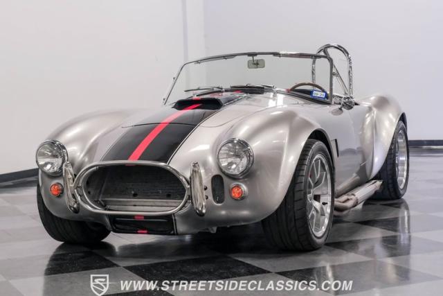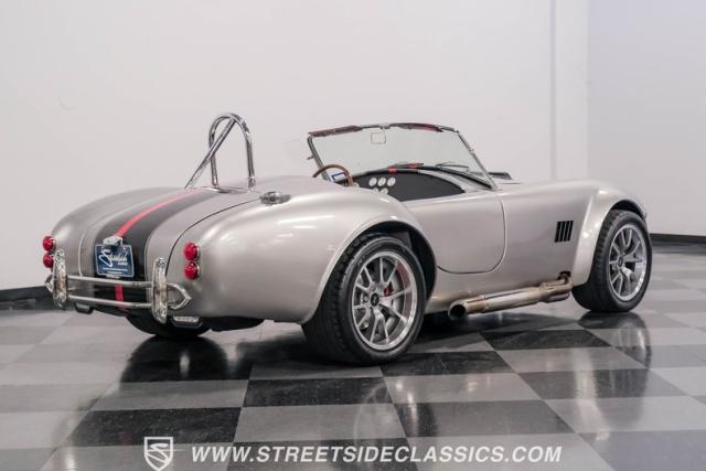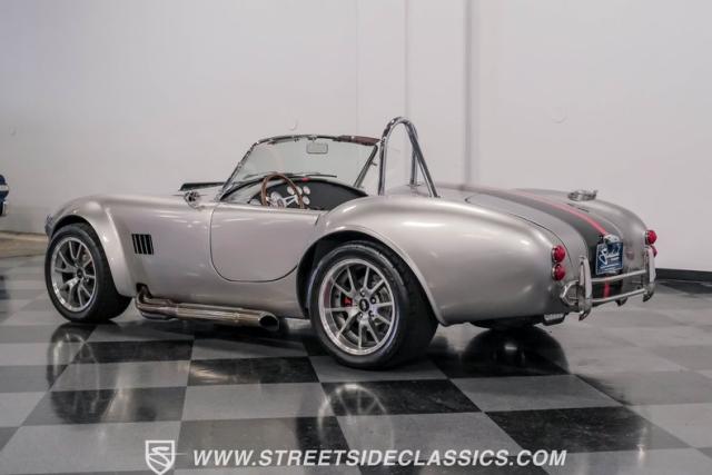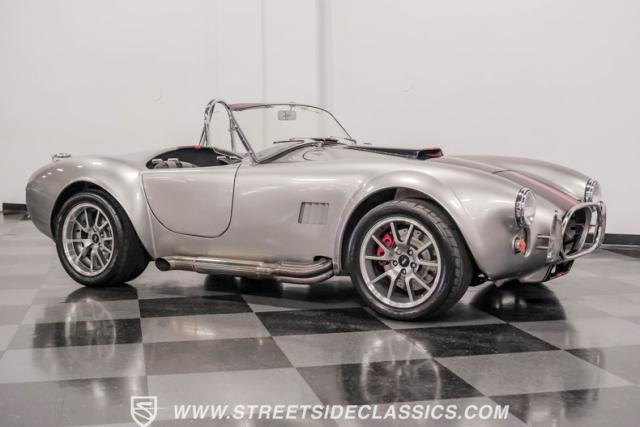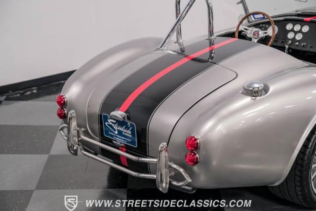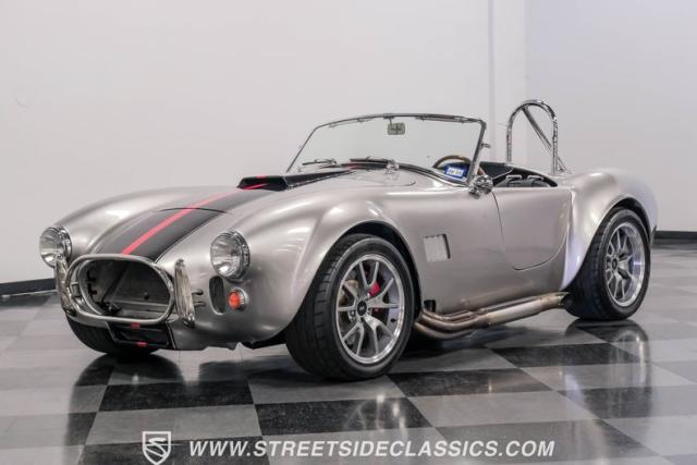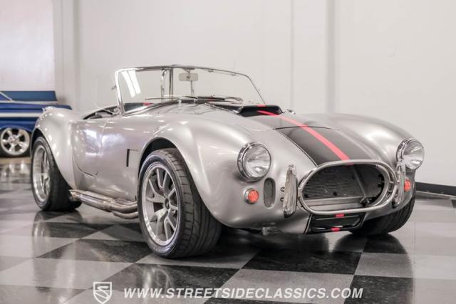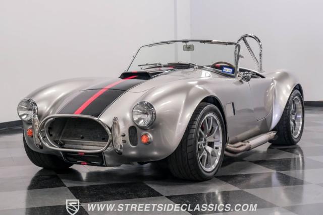 This 1965 Shelby Cobra Factory Five Mark IV Supercharged has traveled just 4,509 miles since its 2020 build. The silver metallic body, a fiberglass creation, sports black and red stripes that emphasize its aggressive profile. SVE wheels, 17 inches in diameter, fill the wheel wells with authority. Nitto tires 275/40ZR17 front and 315/35R17 rear provide substantial grip for this road-legal powerhouse. Muscular side pipes peek out just behind the front wheels, hinting at the auditory experience to come. This Cobra\'s low-slung stance and classic lines make it unmistakable on any street or track.