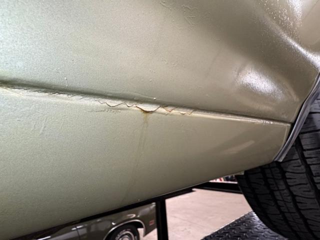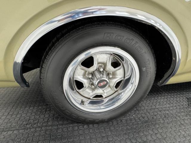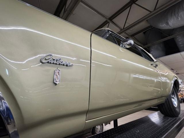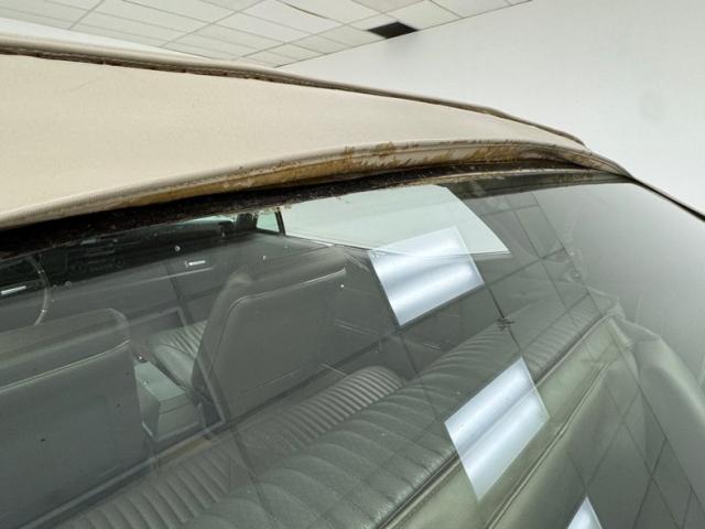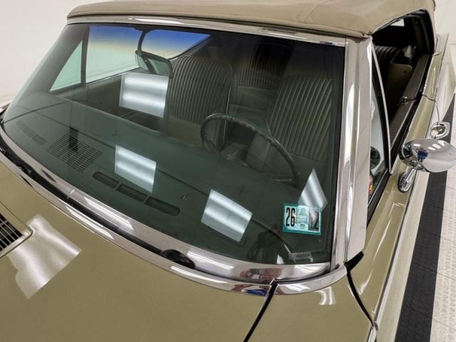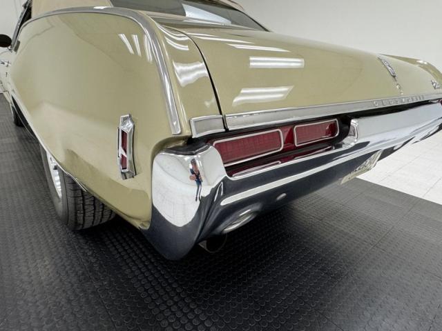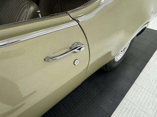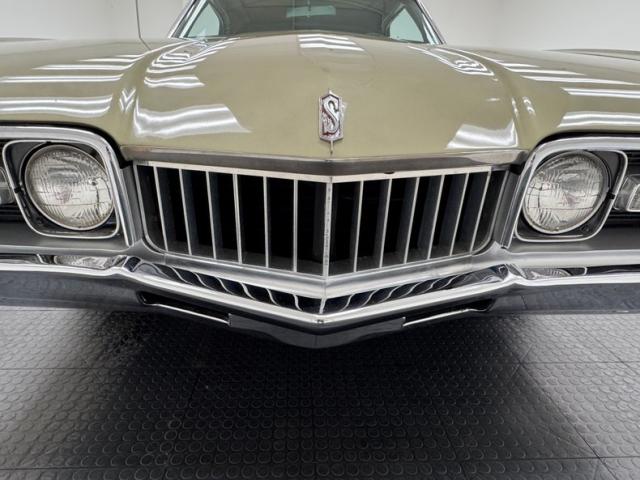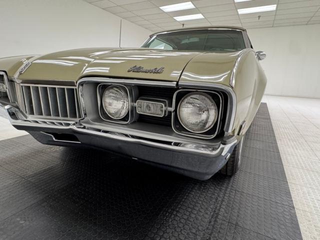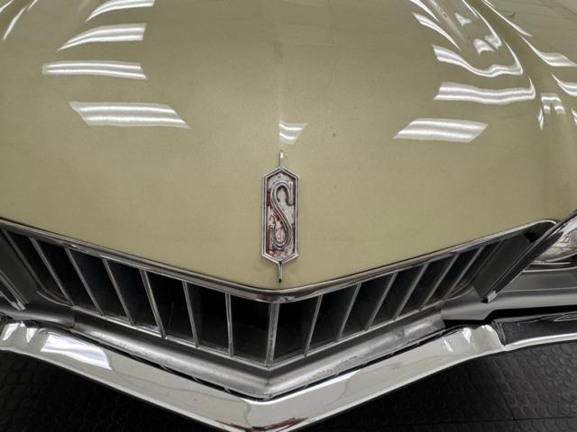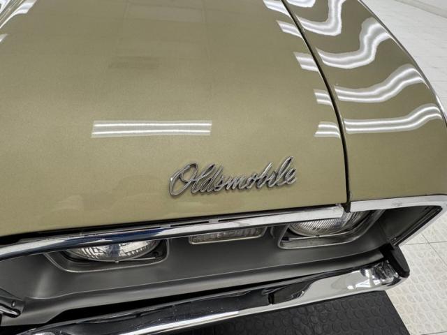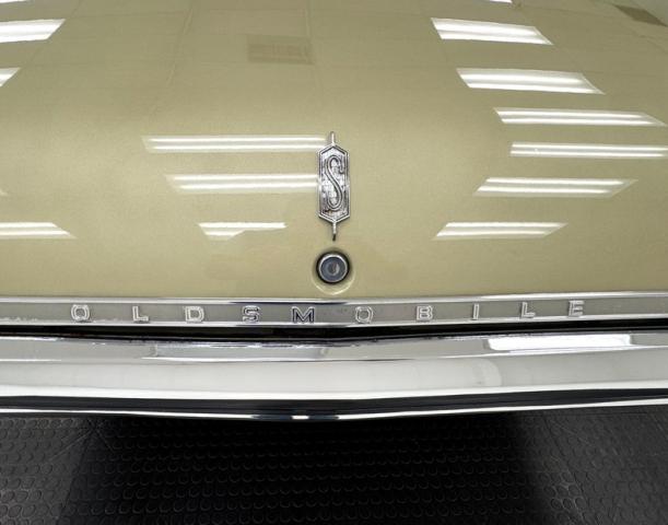 Wearing its original color in now two stage application, the Willow Gold is a welcome change of direction from your typical palette of colors and as result, stands out. The grille and headlight configuration are a one year only design adding even more uniqueness to this beautiful A-body. Chrome bumpers shine bright with the rear panel taking in the narrow horizontal tail lights at the base of a broad decklid over dual exhaust. A beige canvas room adds a subtle contrast to the greenish gold paint, and 14-inch Oldsmobile Super Stock II also wears a lighter shade while trim rings and wheel opening molding dress things up.At a distance, this is a show ready car. Closer examination reveals some imperfections included areas of chipped paint, a rust hole on the hood, a rock chip in the windshield, some adhesive that\'s failed on the rear window, various chips, scratches, bubbling, emblem fading, rough surfaces under paint, and a dent on the front fender near the bumper.