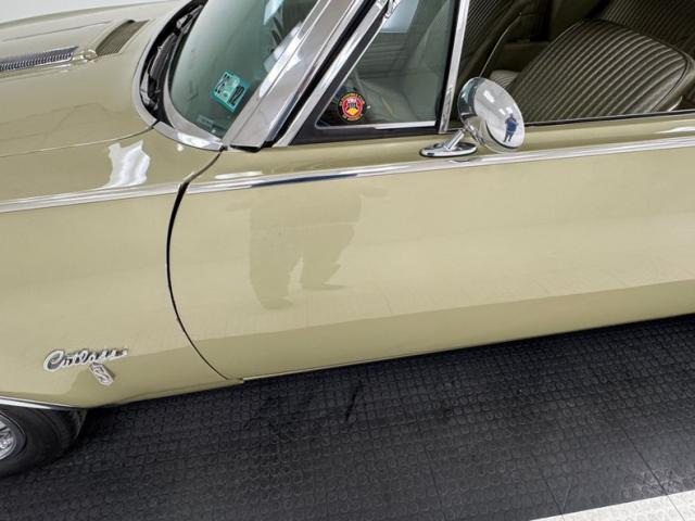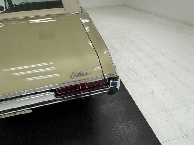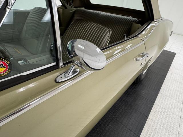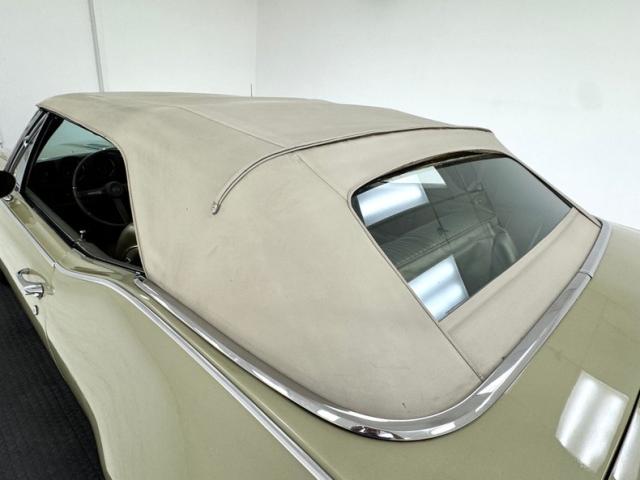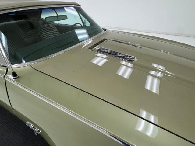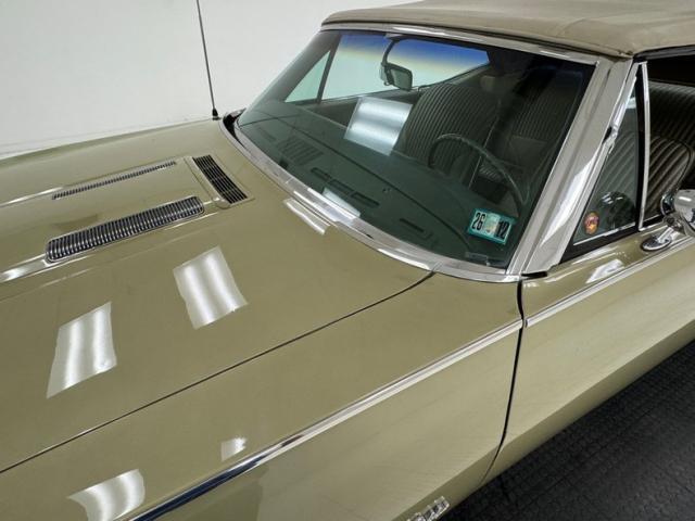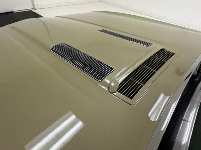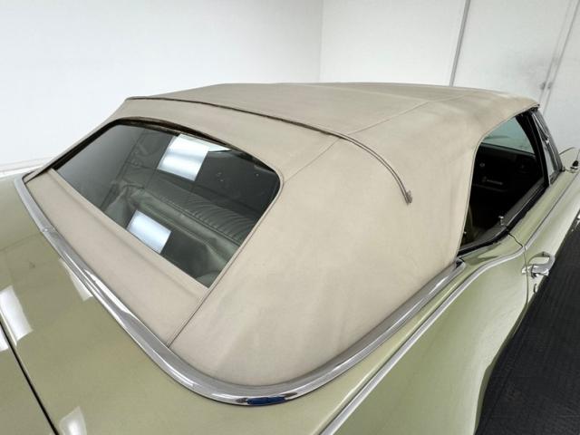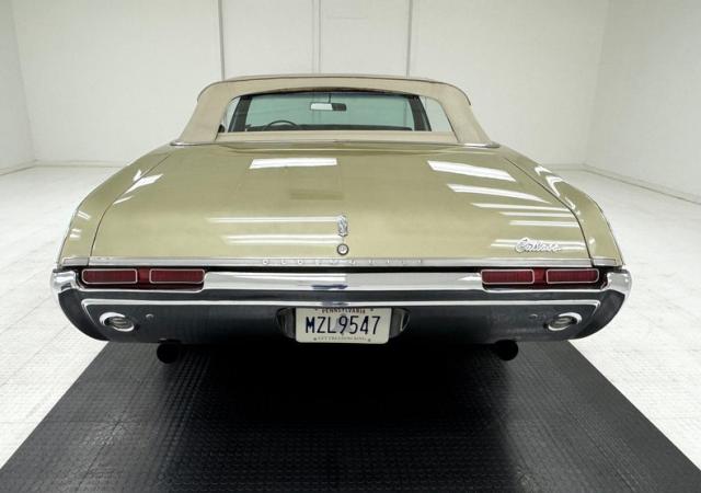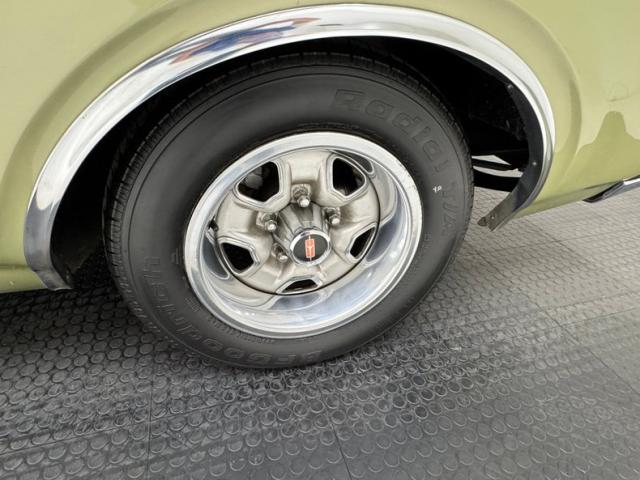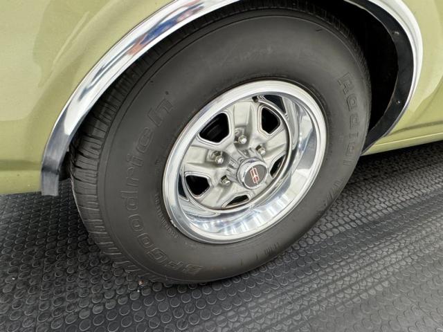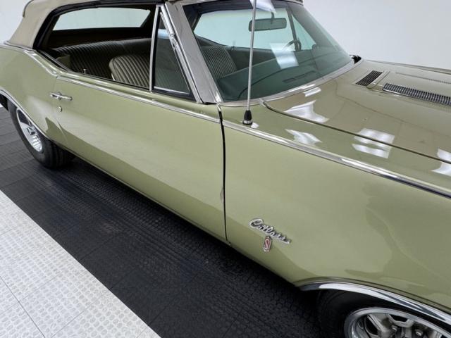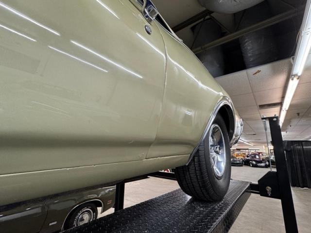 Wearing its original color in now two stage application, the Willow Gold is a welcome change of direction from your typical palette of colors and as result, stands out. The grille and headlight configuration are a one year only design adding even more uniqueness to this beautiful A-body. Chrome bumpers shine bright with the rear panel taking in the narrow horizontal tail lights at the base of a broad decklid over dual exhaust. A beige canvas room adds a subtle contrast to the greenish gold paint, and 14-inch Oldsmobile Super Stock II also wears a lighter shade while trim rings and wheel opening molding dress things up.At a distance, this is a show ready car. Closer examination reveals some imperfections included areas of chipped paint, a rust hole on the hood, a rock chip in the windshield, some adhesive that\'s failed on the rear window, various chips, scratches, bubbling, emblem fading, rough surfaces under paint, and a dent on the front fender near the bumper.