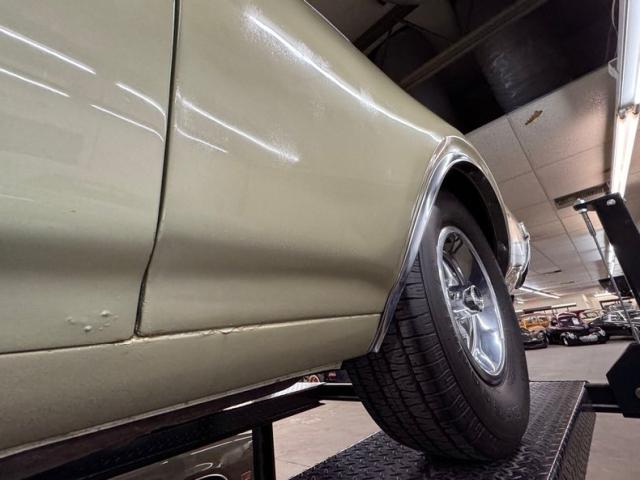 The gold vinyl door panels are handsome but show some age including staining and cracking on the armrest while the bucket seats reveal age through discoloration, a seam tear, and some roughness on the plastic shell. Up front, the original steering wheel has a crack in the plastic and some discoloration but it leads to a dashboard that\'s in great shape in fantastic period green gold. A courtesy light looms above the AM/FM radio and the glove box contours with the bend of the mid dash. A center console houses a wood handled shifter on a polished face plate for a Powerglide automatic, (but more on that later), all over gold loop carpet that\'s in very good condition. A green plaid vinyl mat covers the trunk where a spare Super Stock wheel and tire reside.