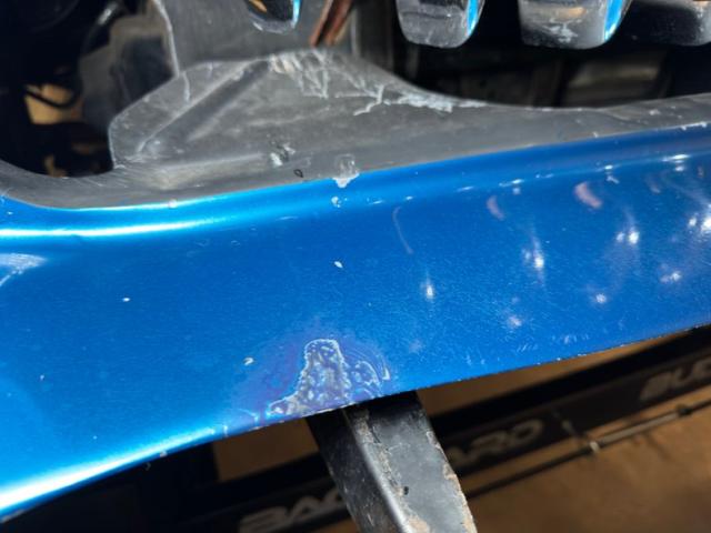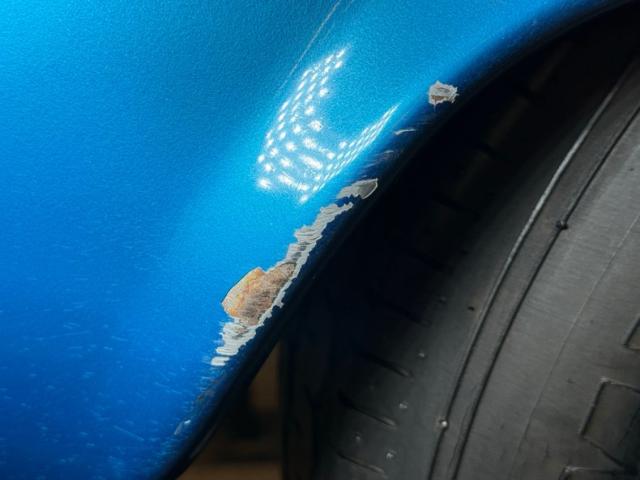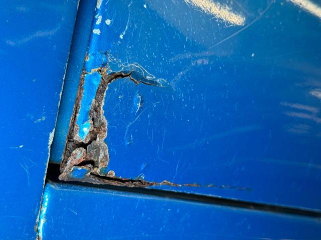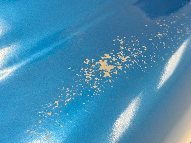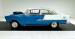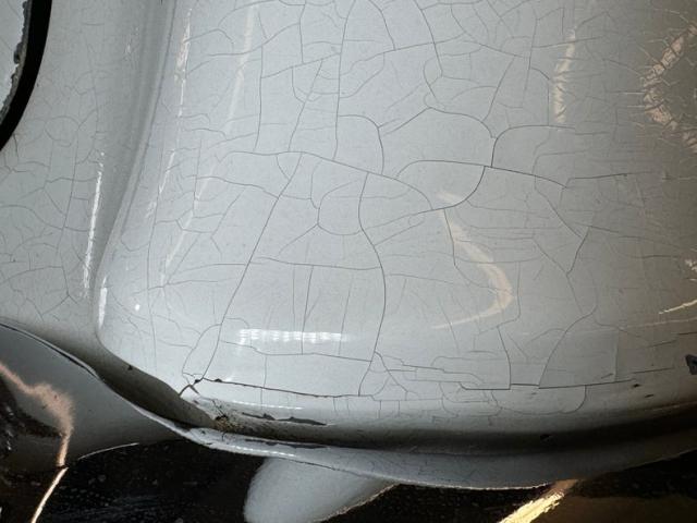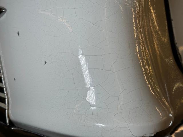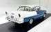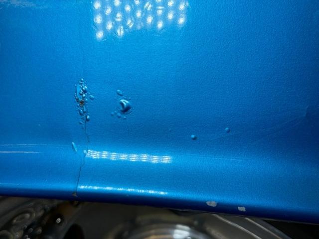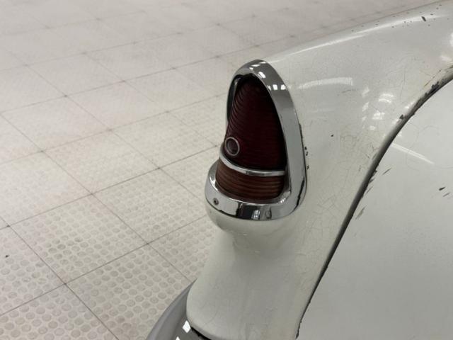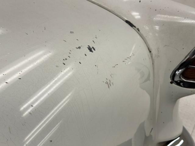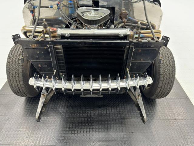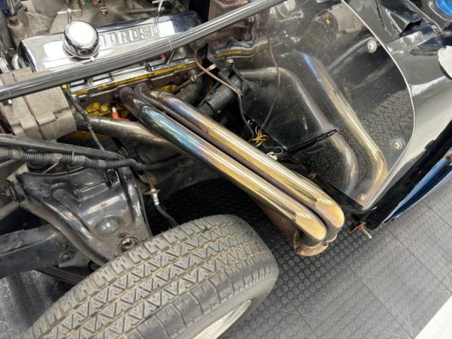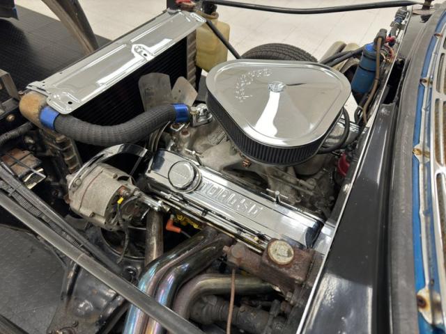 Iconic 50\'s two tone paint jobs will never be uncool and this one is White over Medium Blue Metallic, and of course delineated by the jet-like side trim on the rear quarter. Losers will claim they just got beat by white Chevy when in fact it bears two colors. Hood pins up front are actually front clip pins because the entire front is one fiberglass piece that lifts off and allows full access to the engine underneath, which by now you\'re guessing is probably not a 283 cuber. The custom grille is reminiscent of the early Corvettes and stays in place when the front is removed. 15-inch Weld DragLite wheels in front and back create an aggressive, raked stance while out back, two big exhaust pipes extend past the bumper in gleaming chrome and pins are attached to each corner of the trunk lid as it can be fully removed. Metalwork is okay, however the paint has imperfections that include some surface rust on the roof, scratches and cracking throughout, checking and flaking paint throughout, holes in the fiberglass that include previously drilled ones, invasive rust on a door corner, areas of bubbling, cracked fiberglass on the front, and peeling chrome on the side trim.