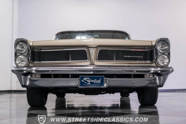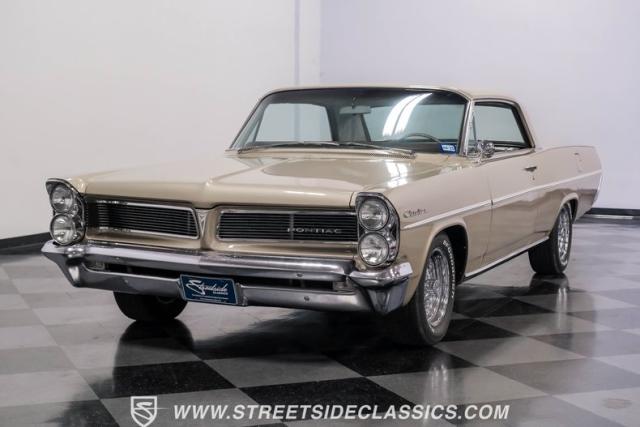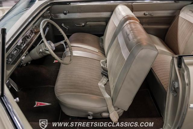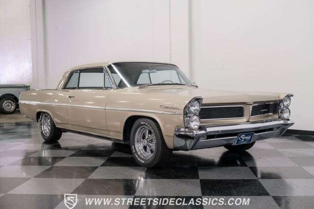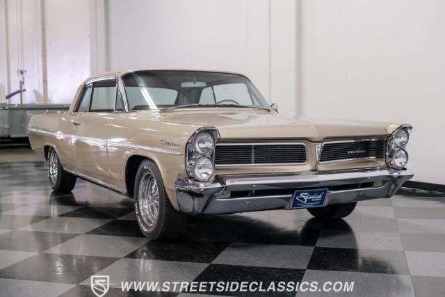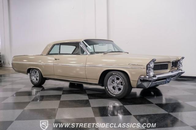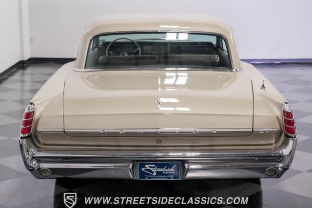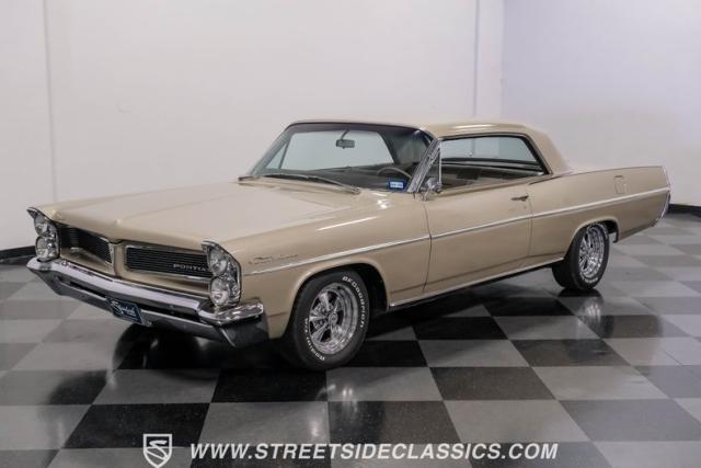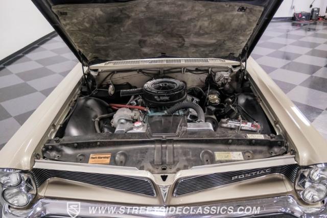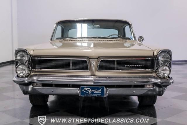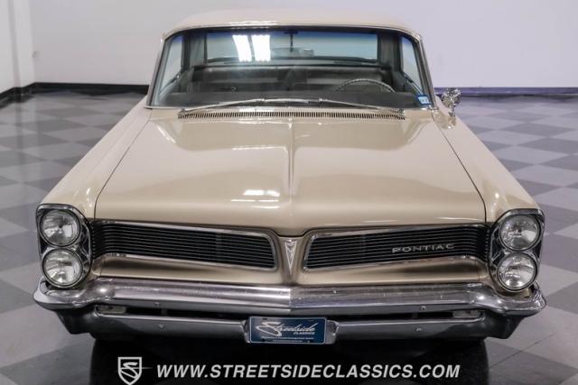 This 1963 Pontiac Catalina is a remarkable automobile having what is believed to be just three owners in its history. In fact, it has spent the last year undergoing a thorough reconditioning and now sits ready to enjoyed to the fullest. The Caravan Gold repaint, completed in January 2024, showcases it\'s original shade, and while it originally had an Ivory painted roof, we can\'t argue with the Catalina\'s fresh bold look with crisp lines and flowing curves. Chrome Cragar wheels provide an aggressive look, wrapped in fresh BF Goodrich 215/65R15 tires on all four corners. The exterior details shine through with the dual exhaust outlets punctuating the rear view, while the power antenna adds a luxurious touch. A fresh dual exhaust system amplifies this Pontiac\'s road presence.