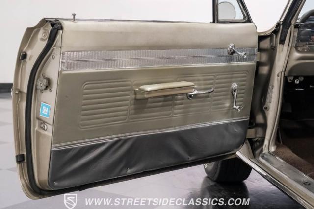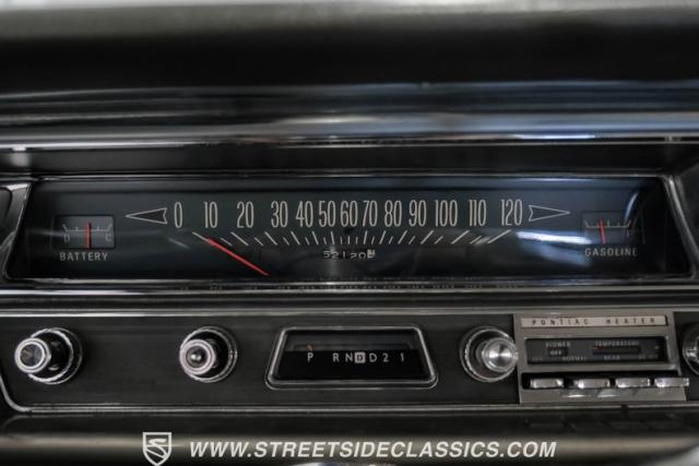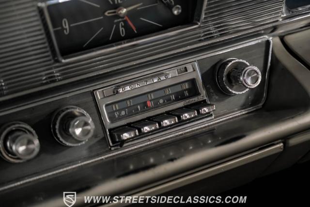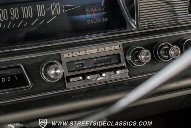 The believed-original fawn-colored interior combines vinyl and cloth materials in an authentic 1960s design. The broad bench seat offers plenty of space for three, with the column shifter keeping the floor clear. The original AM/FM radio with power antenna provides the soundtrack, while an auxiliary oil pressure gauge monitors vital stats. Factory power steering makes maneuvering effortless. The authentic Pontiac floor mats maintain the factory appearance while protecting the carpets.