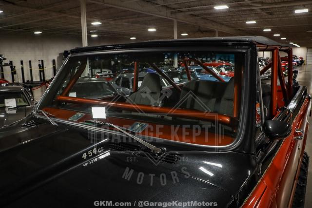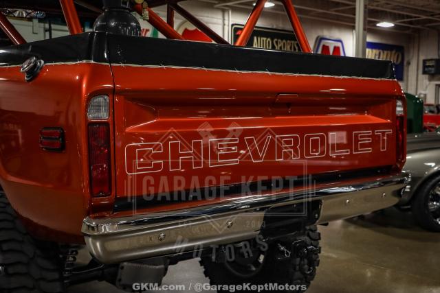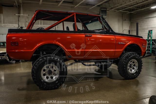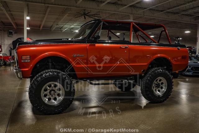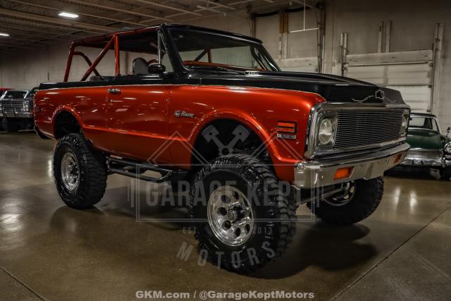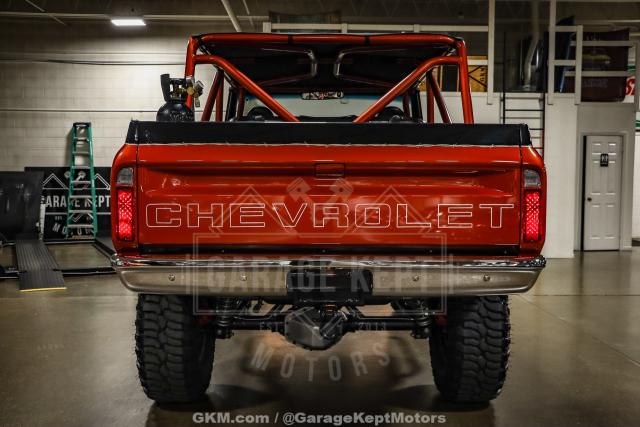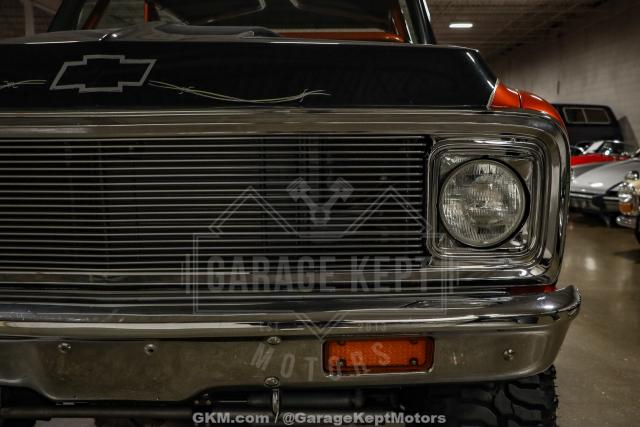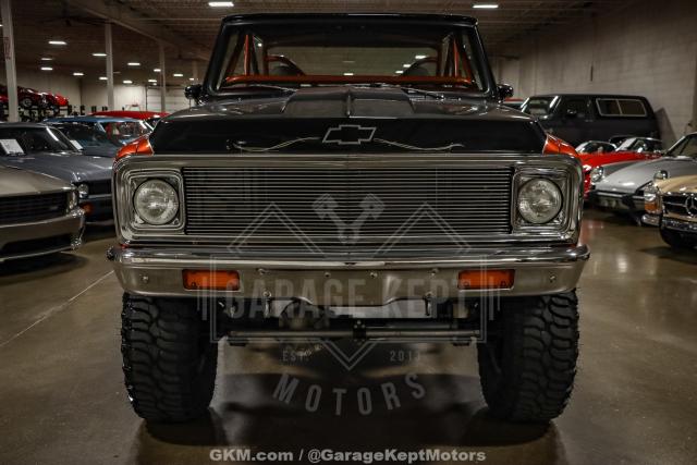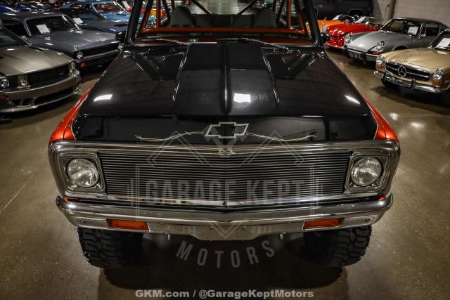 1972 Chevrolet K5 Blazer- Frame Off Restoration in 2013- Custom Orange and Black Paint- Grey Interior with Front Bucket Seats- Rebuilt 454 V8- Automatic Transmission with 4WD- Custom Color-Matching Roll Cage- Black Bimini Soft Top- Power Steering and Power Brakes- 4 Wheel Disc Brakes- Original SPID Label- Lifted with Mickey Thompson Wheels and Off Road Tires- Custom Running Boards- Dual Exhaust with Cutouts - 27k Miles Shown- Frame Off Restoration in 2013- Custom Orange and Black Paint- Grey Interior with Front Bucket Seats- Rebuilt 454 V8- Automatic Transmission with 4WD- Custom Color-Matching Roll Cage- Black Bimini Soft Top- Power Steering and Power Brakes- 4 Wheel Disc Brakes- Original SPID Label- Lifted with Mickey Thompson Wheels and Off Road Tires- Custom Running Boards- Dual Exhaust with Cutouts- 27k Miles ShownThe 1972 Chevrolet K5 Blazer represents the final and most refined year of the highly sought-after first-generation body style, and this example takes that iconic platform to another level. Treated to a comprehensive frame-off restoration in 2013, it blends classic early-70s SUV character with carefully selected modern upgrades. The result is a show-quality build that maintains its vintage roots while delivering serious presence and performance.Finished in striking custom orange and black paint, this K5 commands attention from every angle. The bold color combination highlights the Blazer\'s squared-off lines and removable-top design, while the lifted stance gives it an aggressive, trail-ready posture. Mickey Thompson wheels wrapped in off-road tires fill the wheel wells perfectly, complemented by custom running boards and a black Bimini soft top for open-air cruising. A custom color-matching roll cage not only adds structural integrity but also ties the entire build together visually.Under the hood sits a rebuilt 454 cubic-inch V8, providing the kind of big-block torque that defines classic American 4x4 performance. Paired with an automatic transmission and 4WD, this Blazer is equally at home cruising the boulevard or tackling rugged terrain. Dual exhaust with cutouts gives you the option of a deep, throaty rumble on demand, making sure the sound matches the truck\'s bold appearance.Inside, the grey interior offers a clean and functional contrast to the vibrant exterior. Front bucket seats provide comfort and support, while the upgraded components blend seamlessly with the Blazer\'s vintage dashboard and trim. Power steering and power brakes make this classic SUV easy to handle, and the addition of four-wheel disc brakes significantly improves stopping performance over factory specifications.Adding to its appeal, this K5 retains its original SPID label and shows just 27,549 miles on the odometer. With its documented frame-off restoration, big-block power, and thoughtfully integrated custom touches, this 1972 K5 Blazer stands as a prime example of how to elevate an already iconic American SUV into something truly unforgettable.