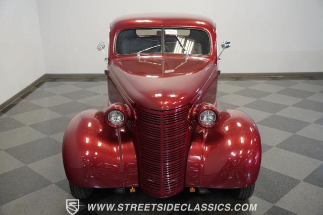 Rolling steel perfection from an era when craftsmanship mattered, this 1938 Chevrolet Master 5 Window Coupe in maroon paint creates an unmistakable presence on any road. Built entirely from steel except for its hood, clean bodywork flows from the deleted front bumper to the custom bullet-style taillights that have been frenched into the rear quarters. Chrome headlight covers complement the paint-matched grille surrounds, while Chevy plaques accent the side skirts. Sitting on 15\" wheels wrapped in 165/80R15 Nexen front tires and 235/70R15 rear rubber, the stance speaks volumes about attention to detail.