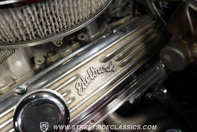 Heart of this machine centers around a 350 V8 with 3970010 casting numbers, breathing through an Edelbrock 4-barrel carburetor mounted on a Performer intake manifold. The TH400 3-speed automatic transmission handles power delivery, while ribbed valve covers, a Mallory distributor, and chromed alternator dress the engine bay. MagnaFlow dual exhaust with long tube headers provides the soundtrack, supported by I-beam front suspension and solid rear axle with leaf springs. Front disc brakes and power steering complete the mechanical package.