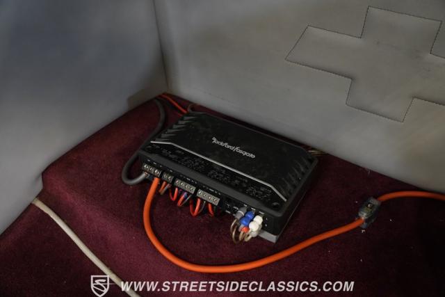 Gray vinyl bucket seats from Lincoln\'s 1980s lineup provide comfortable seating inside, while a floor console with cup holders adds practicality to the classic layout. The tilt steering column features a wood-wrapped wheel that pairs with Autometer analog gauges set in a billet surround. Billet accessories dress the dashboard and steering column, creating a cohesive theme throughout the cabin. A Kenwood single din radio with Bluetooth capability sits under the dash, supported by speakers and a 12\" subwoofer positioned behind the seats for quality sound.