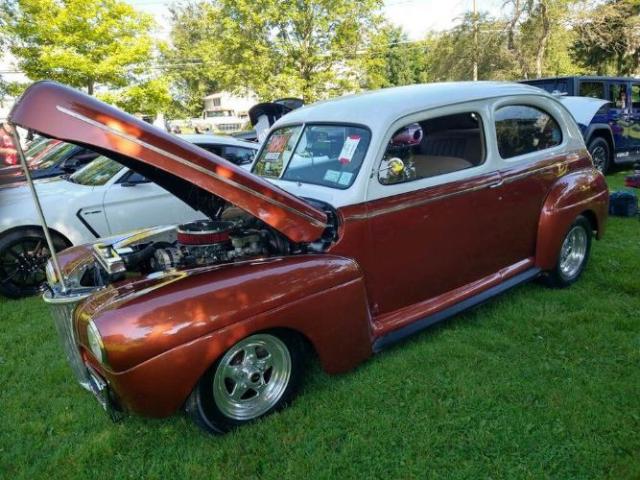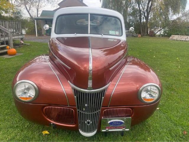 1941 Ford 2door sedan has a 350 engine 300hp has a 700r4 overdrive trans. Has a 373 rear end ratio has 4 wheel disc brakes that will will put you through the windshield! this is a custom frame body off build!! has front stabilizer bar. has a mustang II front end. car has power steering. has ac. has VDO gauges that all work including dash lights and yes speedometer works!! has LED lights all around the car has 3rd brake light has custom headlights with directional built in! the color is copper bottom and white top trunk is finished off. has a beautiful interior! car has 33,522 miles goes down the road like brand new no clunks or rattles!!! has nice weld wheels and nice tires like new! nice sounding dual exhaust out the back.. Automatic transmission Exterior color: Brown Please Note The Following **Vehicle Location is at our clients home and Not In Cadillac, Michigan. **We do have a showroom with about 25 cars that is by appointment only **Please Call First and talk to one of our reps at 231-468-2809 EXT 1 ** FREE Consignment Visit Our Site Today Easy To List Your Vehicle and Get it Sold in Record Time.