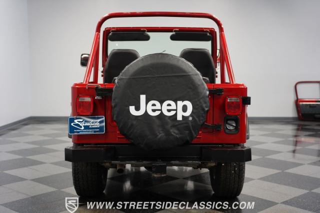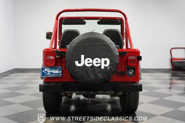 The black interior serves as your command center for outdoor missions. The floor-mounted shifter and center console put essential controls within reach, allowing you to focus on the adventure ahead. Clear gauges keep you informed of your Jeep\'s vitals, while the AM/FM radio lets you choose between nature\'s soundtrack or your favorite tunes. The steering wheel, worn smooth by countless expeditions, connects you to the spirit of exploration.