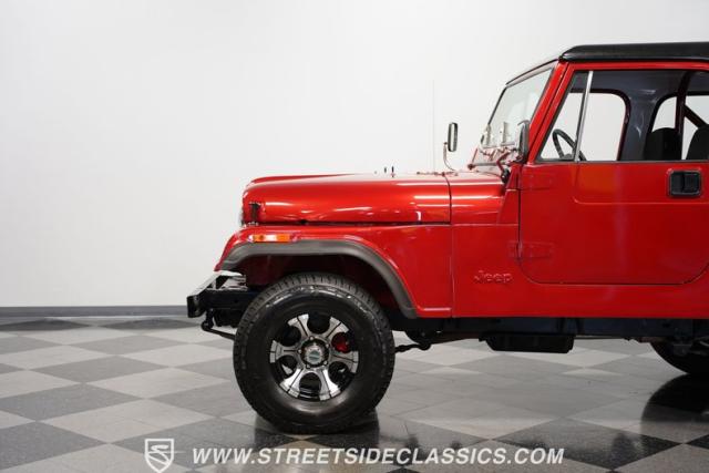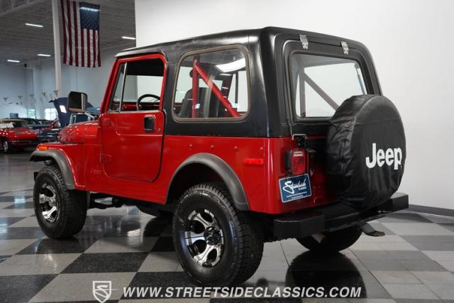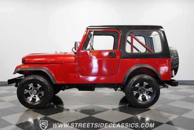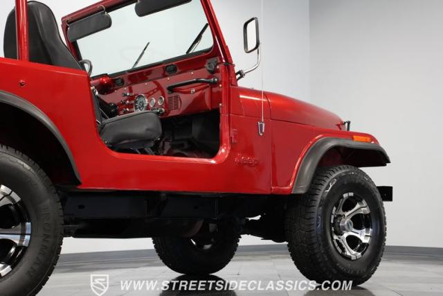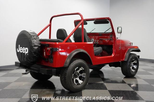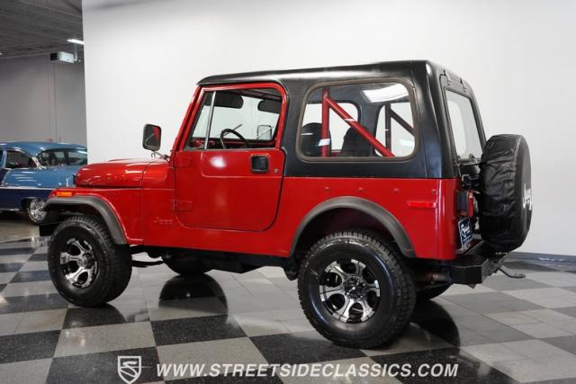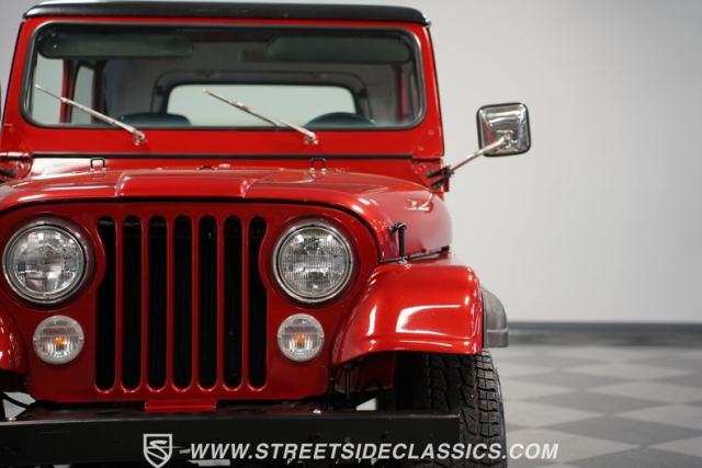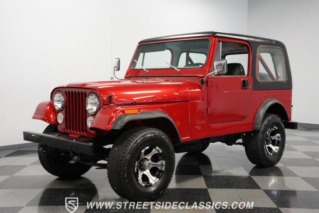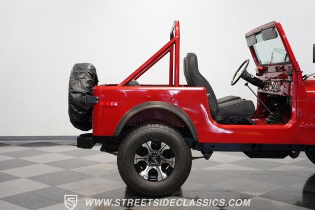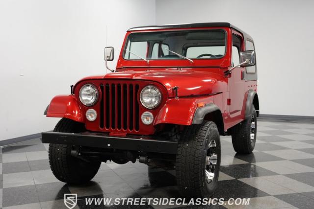 This solid 1978 Jeep CJ7 is a true American explorer built to conquer trails and forge new paths. Its metallic burgundy exterior shines like the setting sun over a rugged landscape. The black hardtop stands ready to shield you from nature\'s elements or pop off for open-air freedom. Beefy 31x10.50R15LT tires, mounted on 15-inch aftermarket wheels, claw at the earth, itching to climb mountains and forge streams. A diamond plate boxed rear bumper adds extra protection for your wilderness quests.