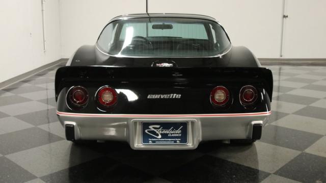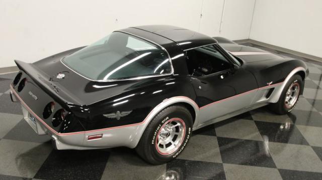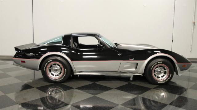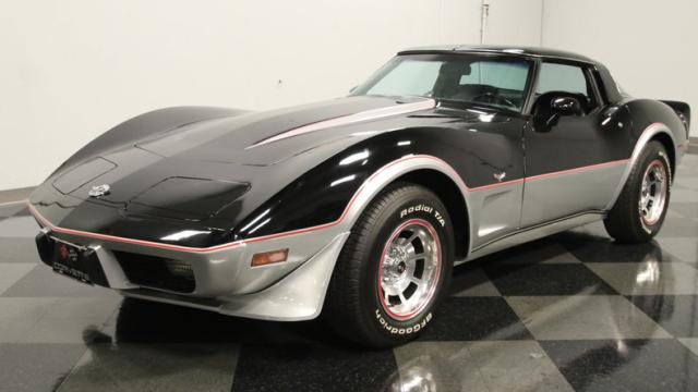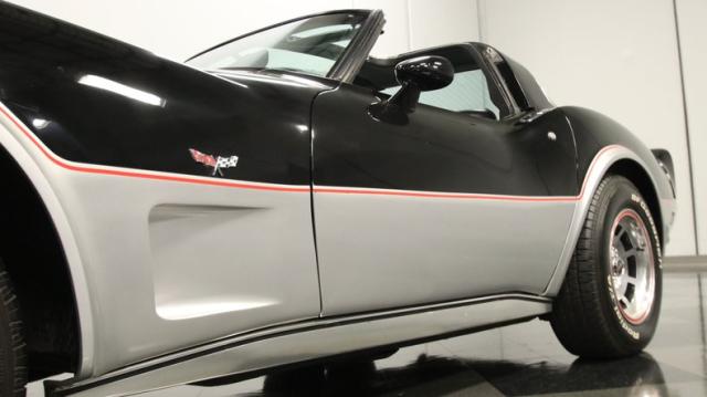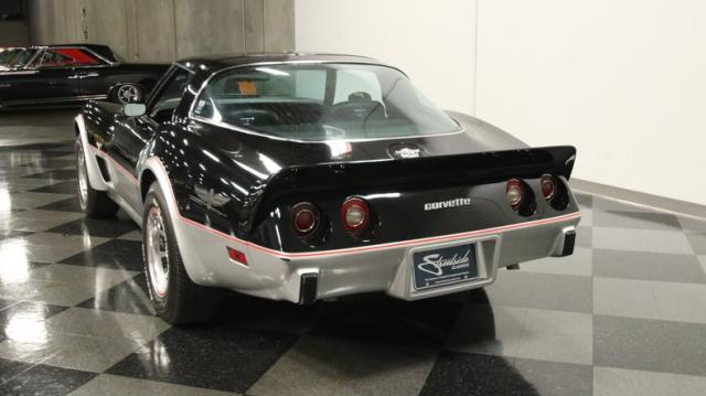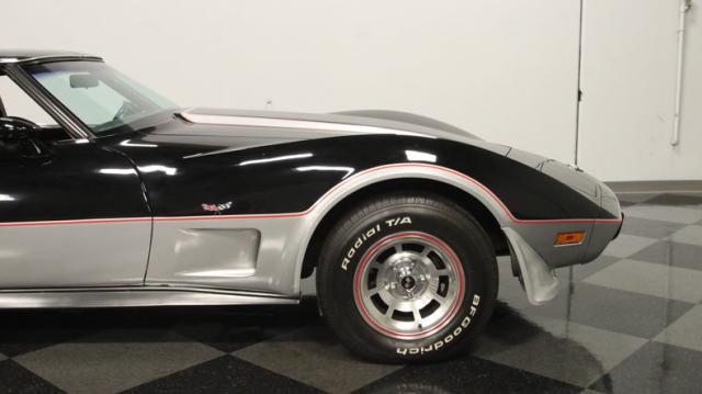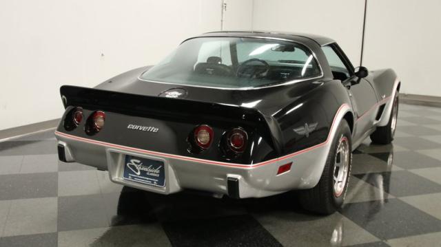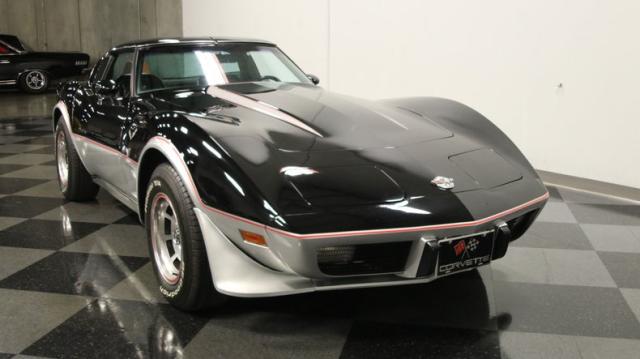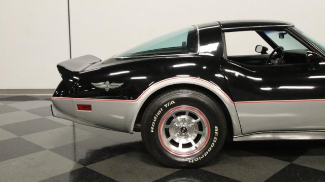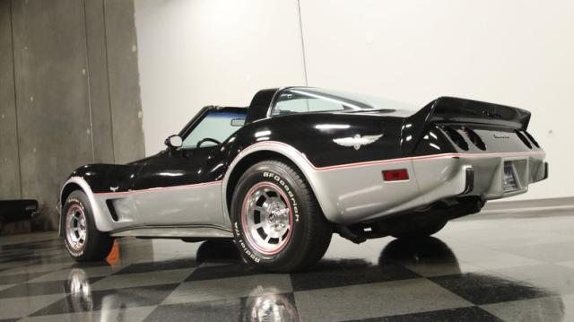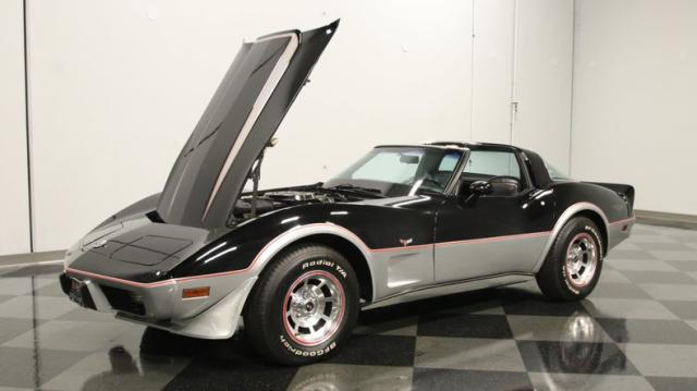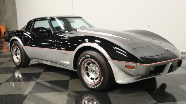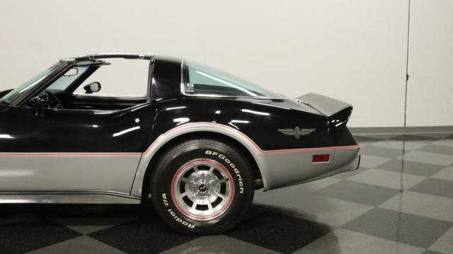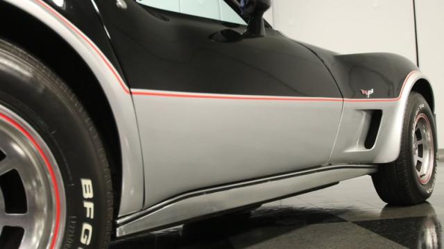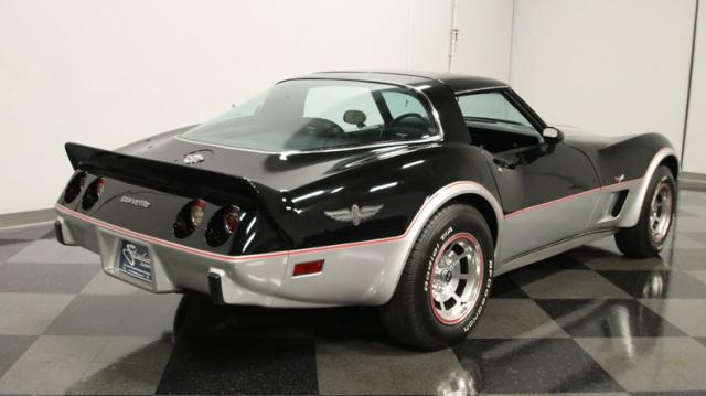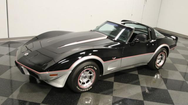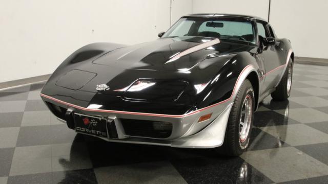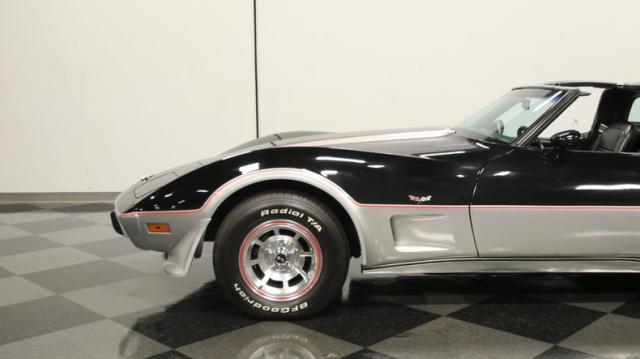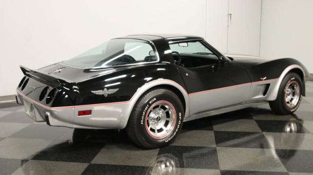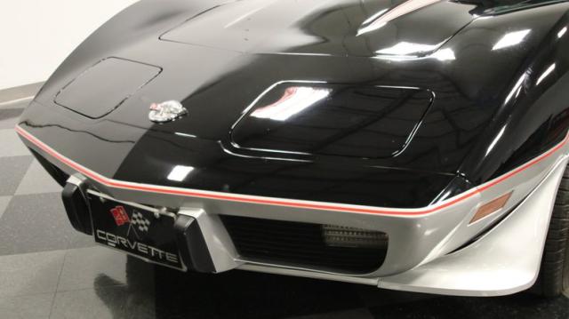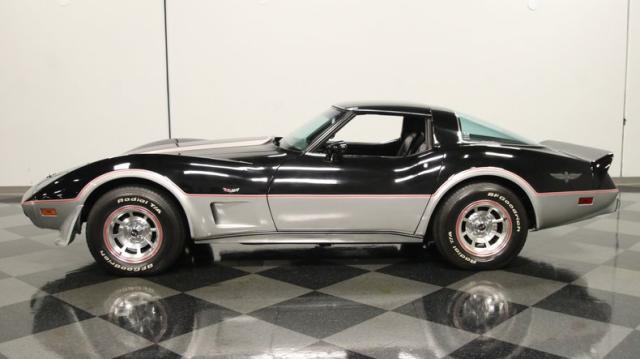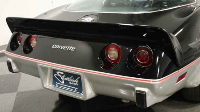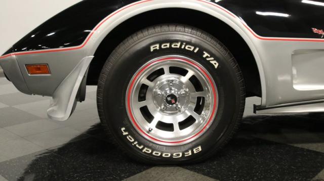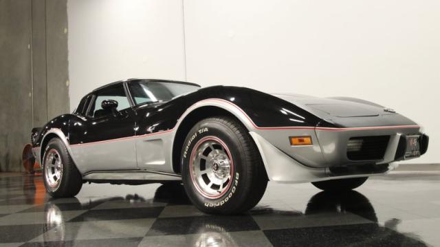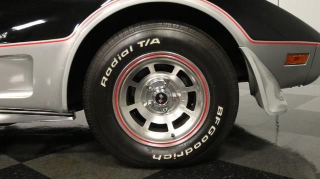 This C3 has led an interesting life thus far. The buildsheet tells us it was born a desirable full black package inside and out. And the only way to be even more desirable is if your 1978 coupe is an Indy 500 pace car replica. So that\'s exactly how they upgraded the paint theme. It\'s a comprehensive two-tone where the silver lower section also helps highlight the flared fenders and cowl hood. And when it comes to upgraded cars, the whole idea is to have something fun that you can also drive. So we\'re glad to see nothing here gets taken too seriously. It\'s an attractive driver-quality finish, which makes it a nice driver-ready coupe. And you have especially attractive details, like the full-width rear spoiler, a chin spoiler, Indy 500 decals, and special redline alloys that go with the pinstriping. Plus, 1978 was also the Corvette\'s 25th anniversary, and the special bright badging doesn\'t let anyone forget it.