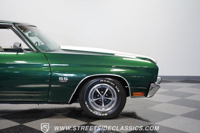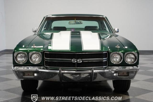 This 1970 Chevrolet Chevelle SS 454 Tribute dominates the street scene with its Fathom Green exterior sliced by white racing stripes. Aggressive from the jump, it rocks an in-your-face cowl hood locked down with pins and a blacked-out grille that screams, \"Get out of my way.\" The 14-inch mag-style SS wheels, wrapped in meaty 225/70R14 rubber, plant this beast firmly on the asphalt, ready to leave lesser rides in the dust.