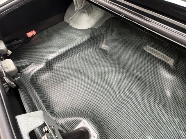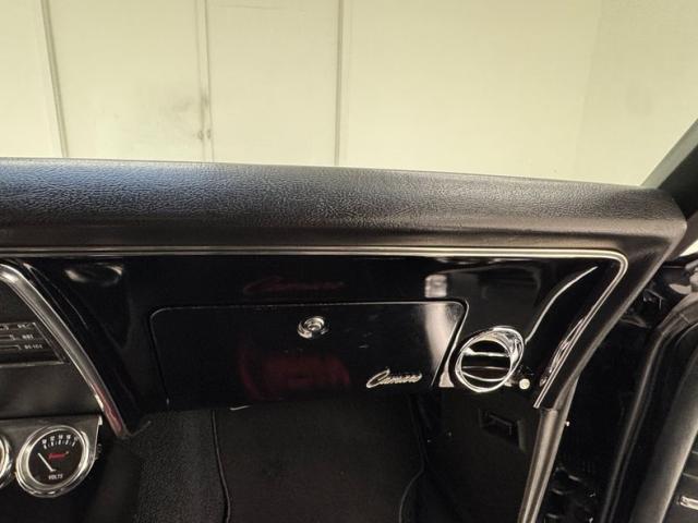 Standard black vinyl door panels greet occupants as they open the door and both present cleanly, so we\'re not surprised by the tall buckets in front which also appear in great condition and so are the rear seats which mirror the ribbed stitching of the front. The controls start with a sport steering wheel which shares the tilt column with a tachometer ahead of the standard instrument cluster in more glossy black backing, and just like the outside, it\'s contrasted by silver with shiny knobs. Vent controls and an added tri-pack of gauges fills the center stack while a B&M shifter fills the console. Black loop carpet is clean and protected by Camaro embroidered mats, the black headliner is in great shape, and the trunk has a like new plaid vinyl mat.