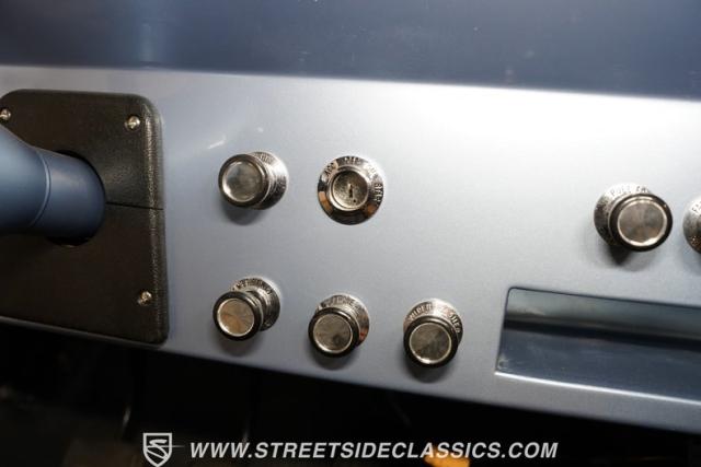 The black vinyl interior serves as your off-road control station. Bucket seats hold you in place across uneven ground, while the custom center console with floor shifter puts the 4-speed manual right where you need it. A blue-painted dash matches the exterior color, creating visual harmony throughout the cabin. The Pioneer radio with Bluetooth and satellite capability adds modern audio to your wilderness runs. Power steering makes handling manageable on tight mountain trails, allowing you to focus on conquering whatever terrain lies ahead.