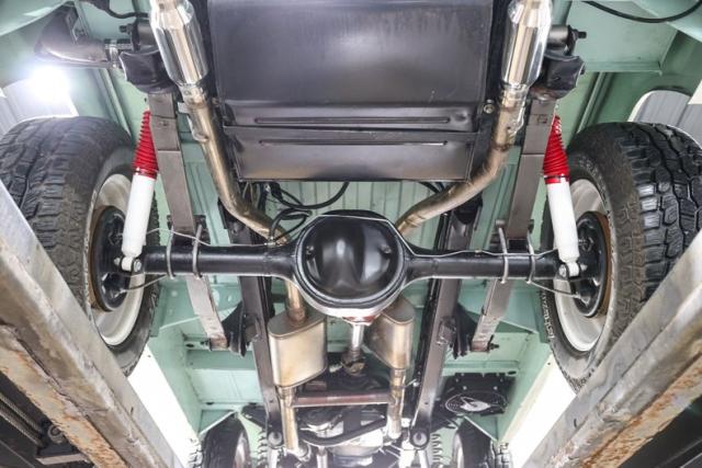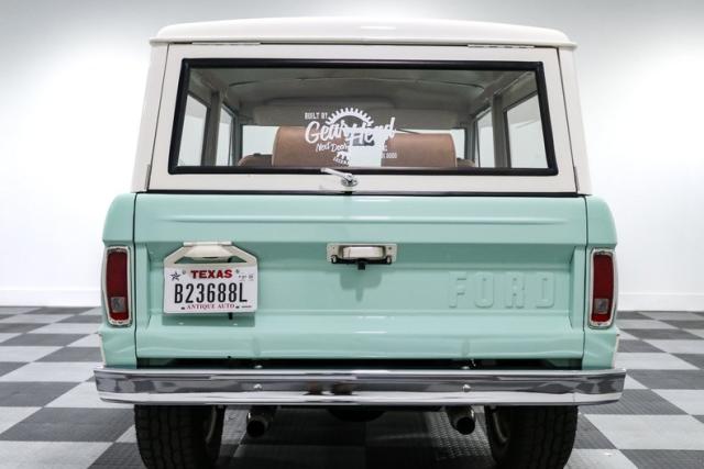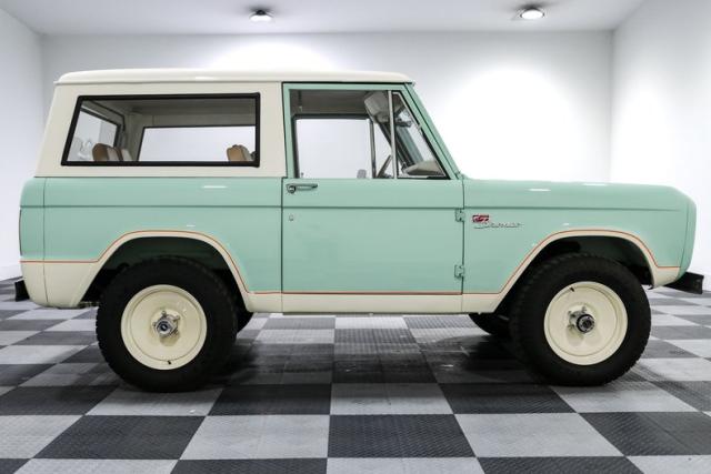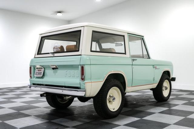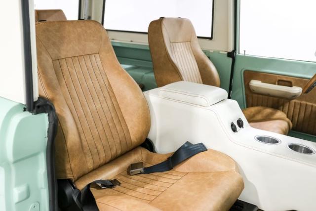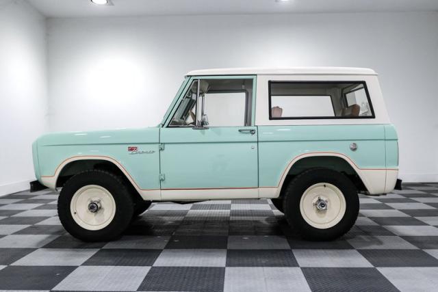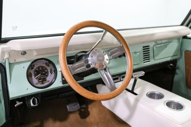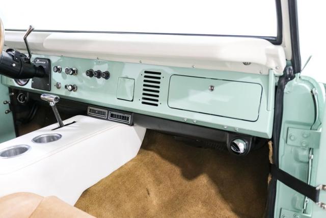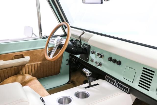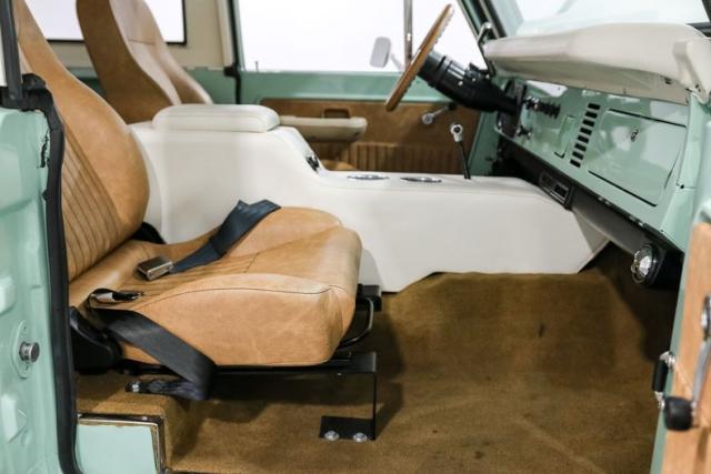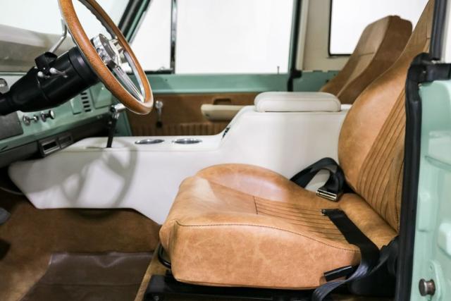 Finished in a striking custom two tone teal over a rich brown interior, this Bronco hits that perfect balance between vintage grit and modern refinement. The uncut rear fenders keep its original proportions intact, while 17 inch smoothie wheels and factory hubcaps nod to its heritage without losing attitude. The removable hardtop and insulated top make it just as ready for a weekend cruise as it is for a trail run.