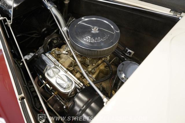 Under the hood, this street rod is powered by a Chevy 350 small-block V8 engine bored 30 over, featuring Edelbrock valve covers, intake, a 4-barrel carburetor, and air cleaner for enhanced breathing and performance. The power steering and power brakes ensure smooth handling and stopping power, while the 3-speed automatic transmission delivers a classic driving feel. The suspension includes coil-over front with rack and pinion steering and a 4-link rear with airbags, providing a balanced and comfortable ride. Chrome accents in the engine bay add a touch of shine to this tidy, older build.