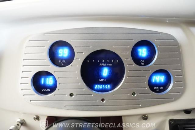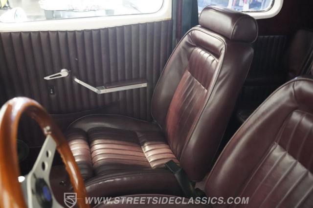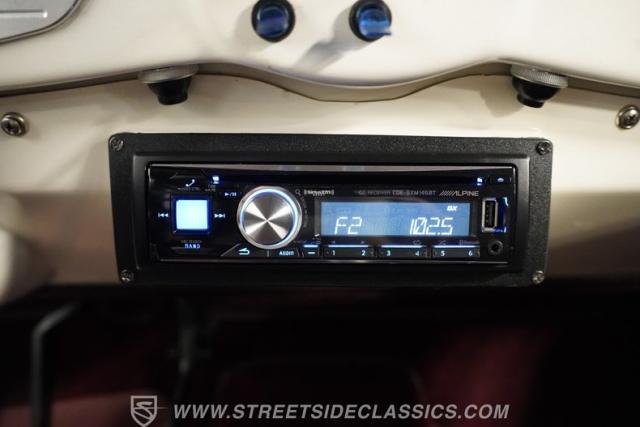 Inside, the cabin welcomes you with a custom burgundy vinyl interior that pairs comfort with classic appeal. Bucket seats provide a cozy ride, while modern touches like a Dakota digital dash, digital gauges, and a floor-mounted shifter add convenience and style. The tilt steering column topped with a wood-wrap wheel and billet instrument cluster surround elevate the driving experience. Power windows, power locks, and a single-DIN aftermarket stereo complete the interior, offering a blend of nostalgia and functionality.