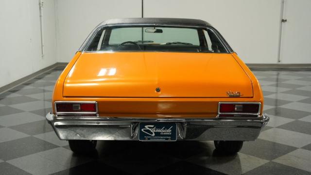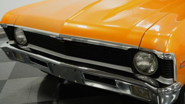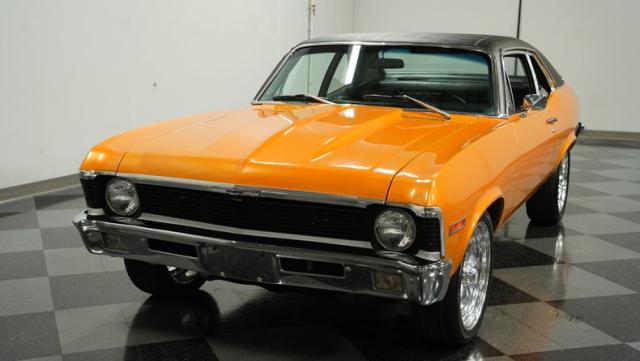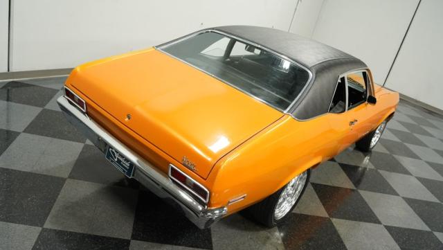 Painted in an attractive burnt orange color that highlights the clean design of Nova, this car looks like the muscle car it really is. A black vinyl top and blacked-out grill contrasts perfectly with the paint color. Adding to the aggressive stance of this classic Nova are a set of polished 18-inch American Racing Torque Thrust wheels wrapped with performance tires staggered 225/45ZR18 front and 245/40R18 rear.