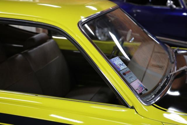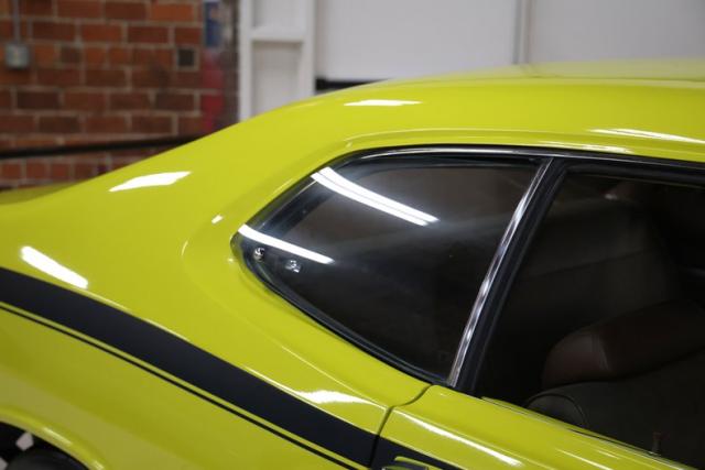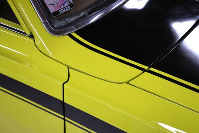 Its exterior is enveloped in a striking Curious Yellow, a bold color that pays homage to the vibrant palette of the muscle car era while amplifying its aggressive presence on the road. This attention-grabbing hue pairs flawlessly with the impeccably maintained tan interior, resulting in a cohesive aesthetic that commands attention and admiration wherever it goes.