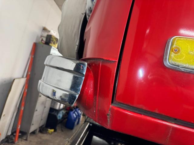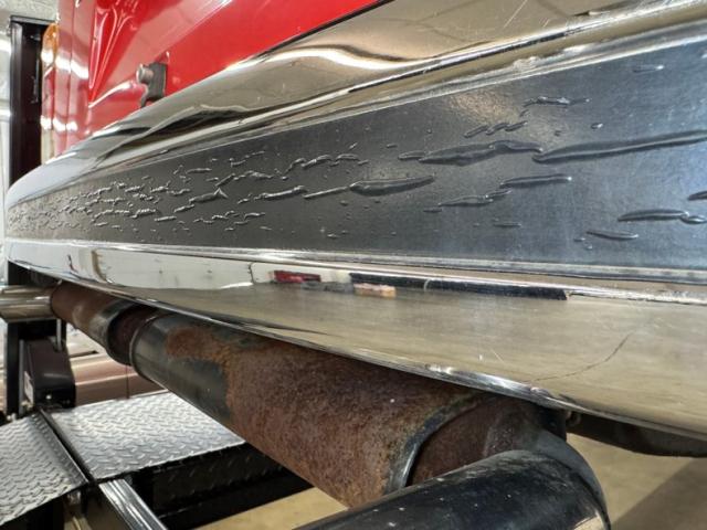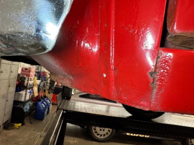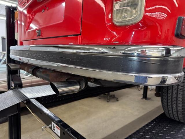 Surface rust prevails throughout the underside and we also note a torn axle boot and some oil under the engine. While up on the lift, we note some rust on the underside of the front doors. Meanwhile, power brakes are on board as front disc and rear drum. The dual exhaust travels a short distance through a stock style muffler and exits through tips spread wide in the back. Suspension is independent front and rear with torsion arms in front and semi trailing arms and torsion bars in back.