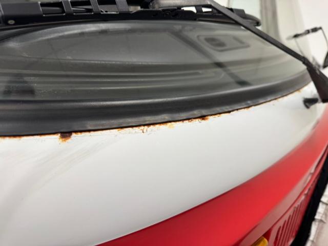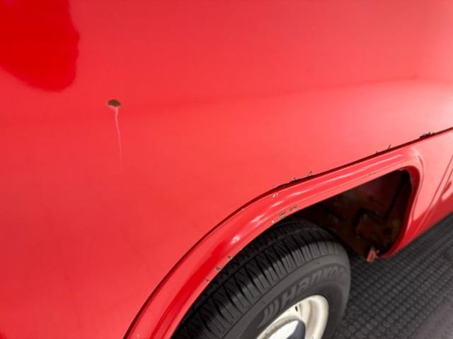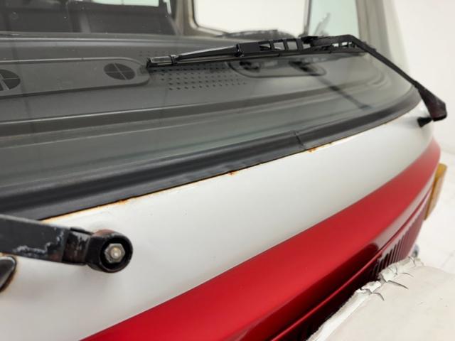 The integrated vent is a cool detail on the two front doors, but the gray vinyl door cards and white paint look like they were in a fight and lost. Things are better inside where low back bucket seats with texture weave vinyl present in good shape while the middle short bench shows some wear and we find the rear bench in decent condition. Back up front, a simple steering wheel fronts the simple dashboard with two gauges including the speedometer, faded plastic levers, and a Kenwood AM/FM/CD radio embedded in the textured black plastic. The shifter rises from the floor which is covered with a rubber mat and in back, the barren, corrugated floor is painted red and shows use. The cargo shelf in back is painted white and is dappled with surface rust that persists in the spare tire bump out.