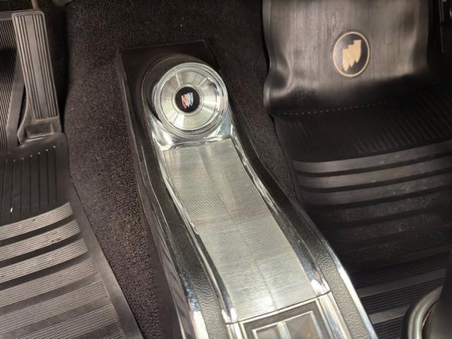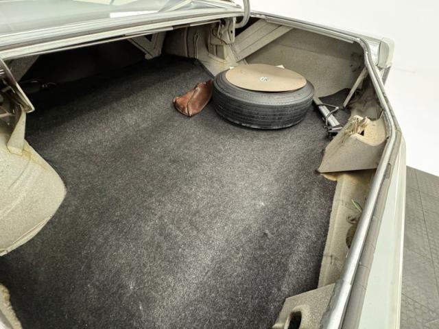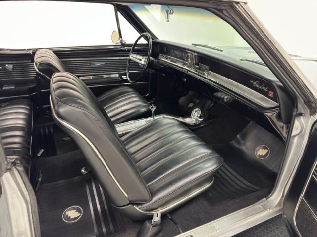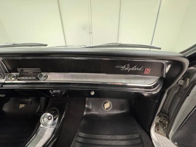 Black door panels striped with silver trim pieces and wearing a carpeted bottom and black painted top are stylish and neat. The low back black vinyl bucket seats up front have a stitched pattern on relatively flat surfaces split by a center console while the back bench is robust and clean and accompanied by the door panel design on the walls along with an armrest and ashtrays. A simple steering wheel with a cross spoke and horn fronts a horizontally displayed speedometer with other square gauge and knobs on a metallic paneled dashboard in clean condition. An AM radio is embedded in the center and a vertically finned dash welcomes the passenger and reminds them they\'re in a Skylark GS. A circular, raised Buick motif fronts the center console which extends rearward to collect the polished shifter in a simple indicator plate which gives way to a center storage compartment sculpted into the console. Black loop carpet under Buick rubber mats looks clean and so does the gray stitched headliner up above. The trunk is also clean and lined with a gray rug.