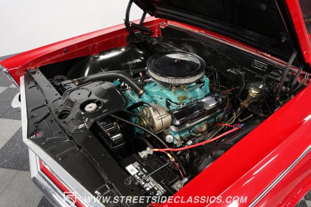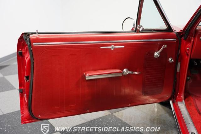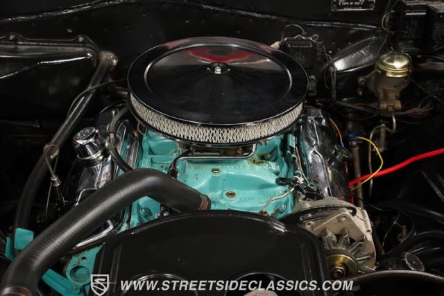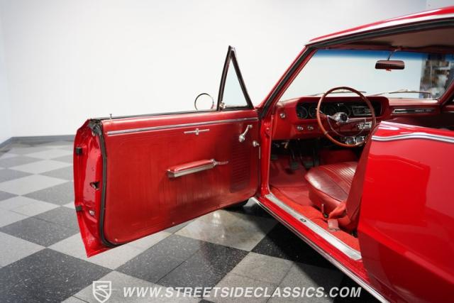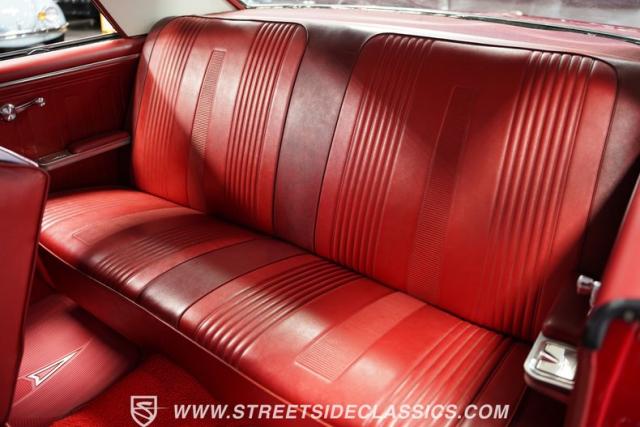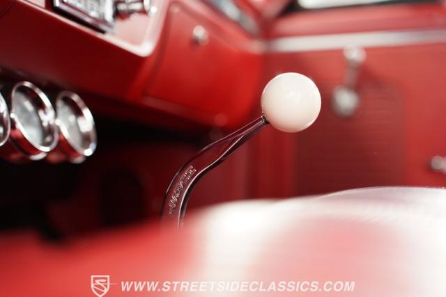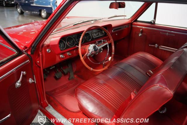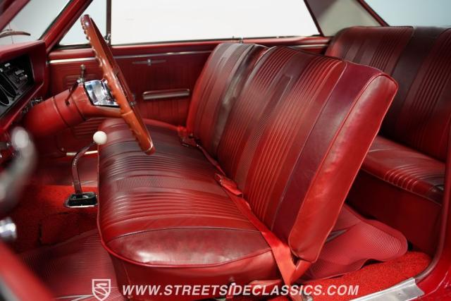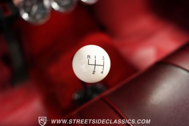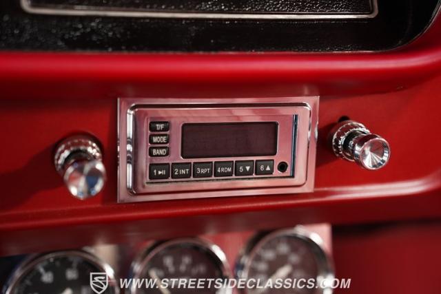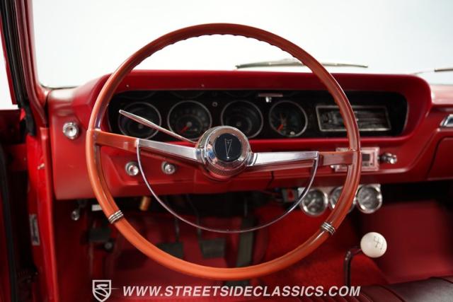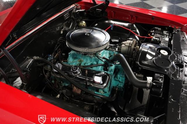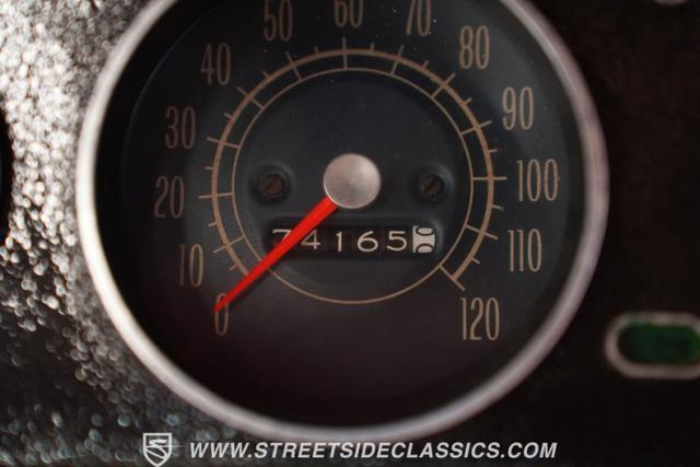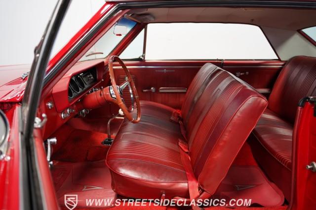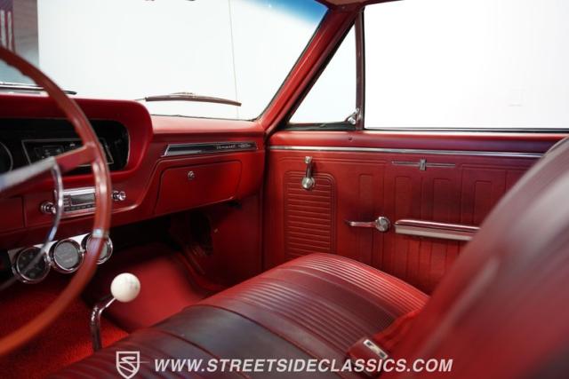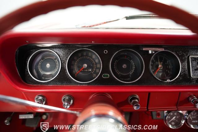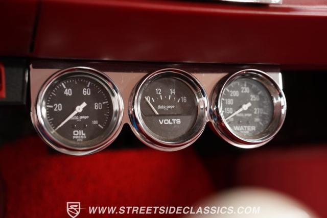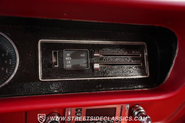 Red vinyl covers the split-bench seats, creating a bold interior that matches the exterior\'s intensity. A Hurst shifter anchors the cabin, inviting you to row through the gears. The dash houses clear, easy-to-read gauges, complemented by secondary oil pressure, voltage, and temperature readouts. Modern conveniences blend seamlessly with classic style - a Retro Sound AM/FM/AUX stereo provides the soundtrack without compromising the vintage aesthetic: the taut headliner and well-maintained carpets round out the cabin\'s refined look.