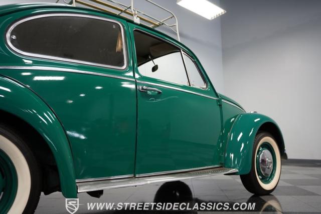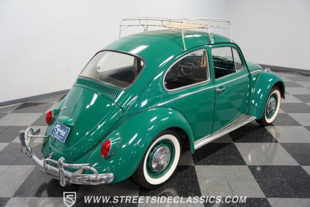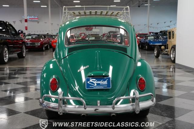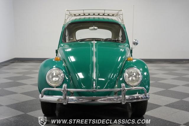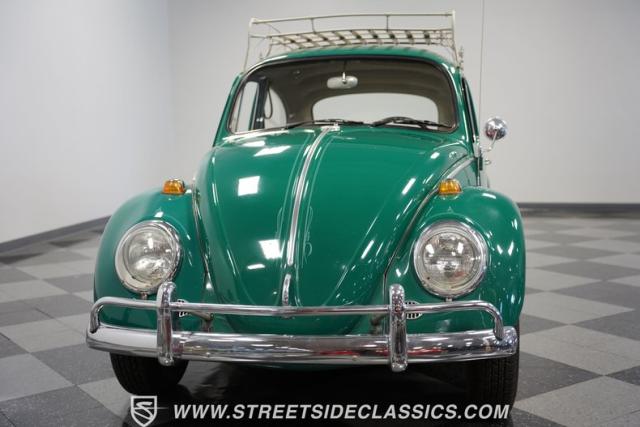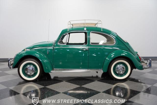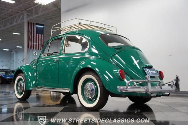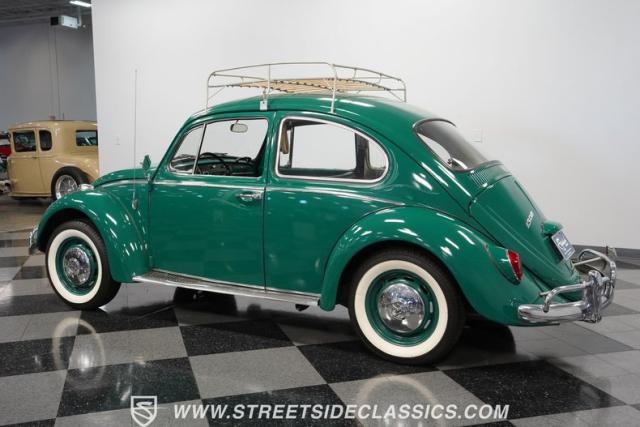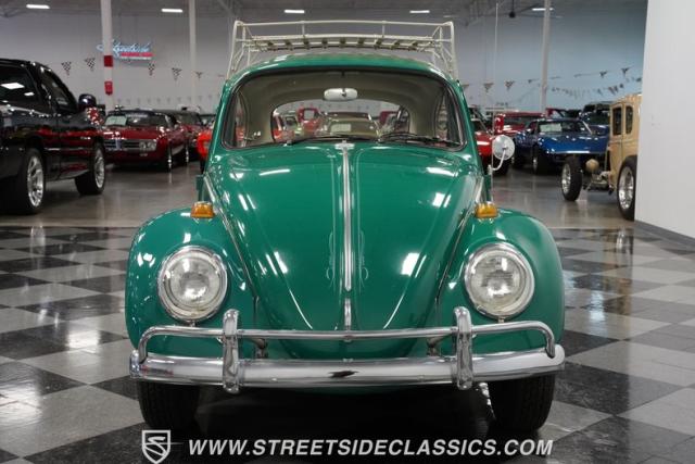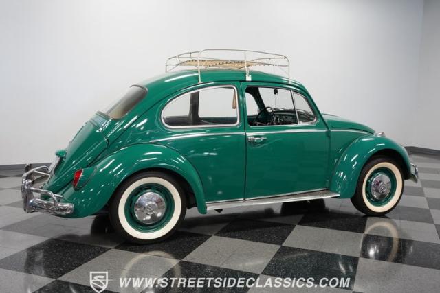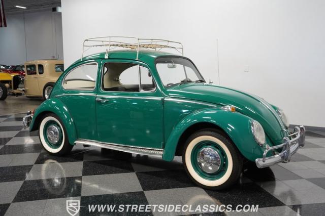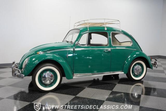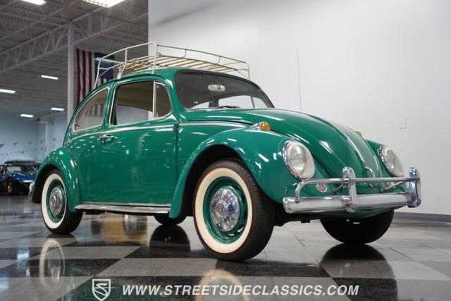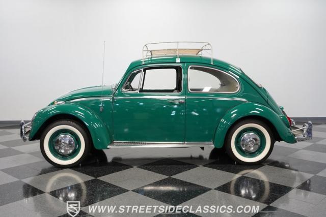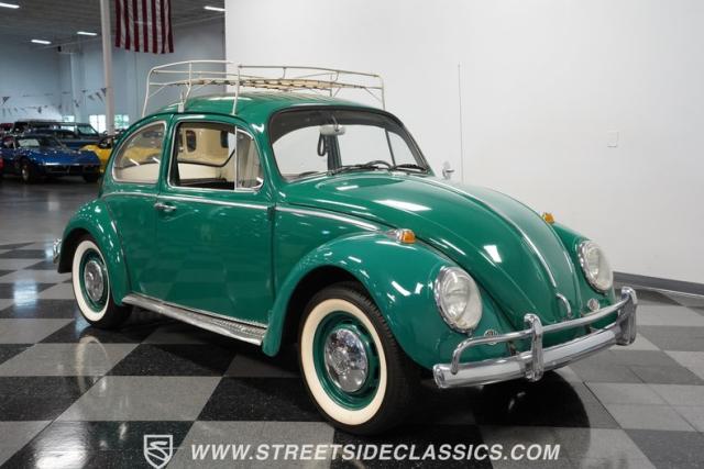 Striking in green with pinstriping that accentuates every curve, this 1966 Volkswagen Beetle is a testament to the enduring allure of these iconic cars. The chrome bumpers with overriders and front fender vents hark back to the Beetle\'s early years, while the roof luggage rack adds a touch of vintage practicality. With 165R15 Coker Classic tires wrapped around 15\" wheels, this bug has a period-correct stance and is ready to roll.