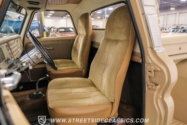 Inside, the tan interior blends comfort with classic truck aesthetics. Custom bucket seats with a floor shifter offer a sporty feel, while the tilt steering column and custom steering wheel improve ergonomics. The dash sports a nice pad that matches the overhead console, housing a sound system with Bluetooth connectivity. A GPS speedometer keeps tabs on your velocity, and additional gauges for fuel, voltage, and temperature provide all the vital info. New carpet and recovered door panels round out the refreshed cabin.