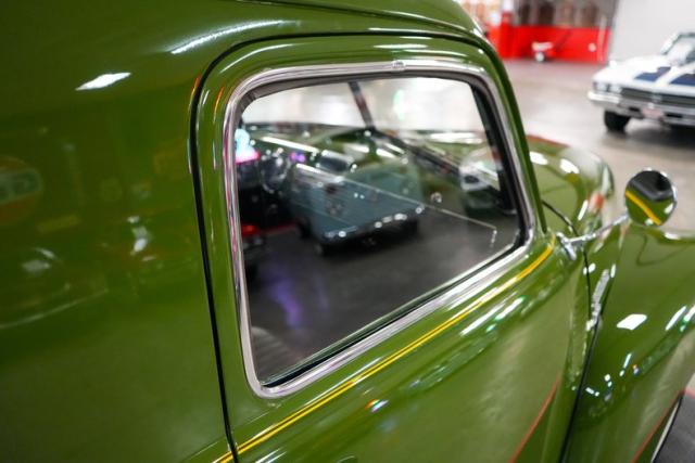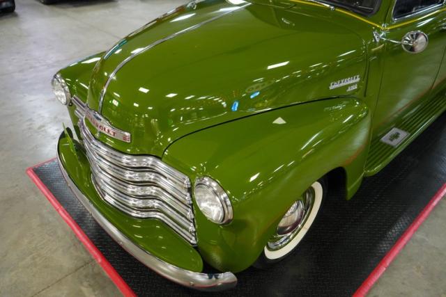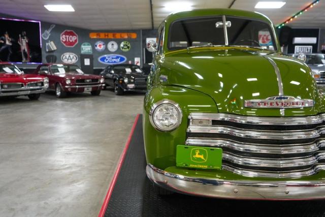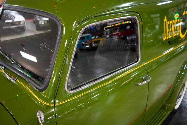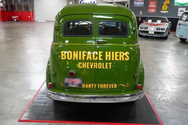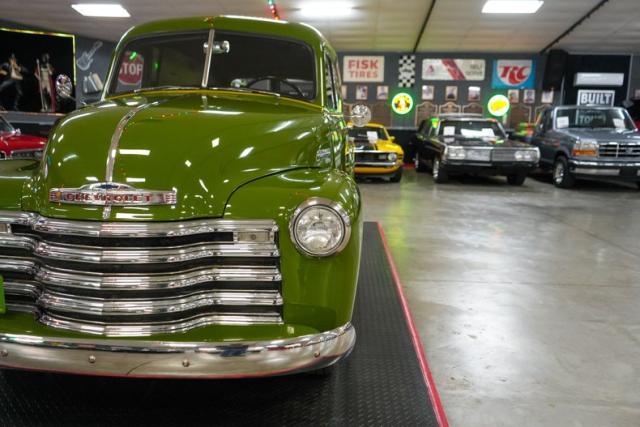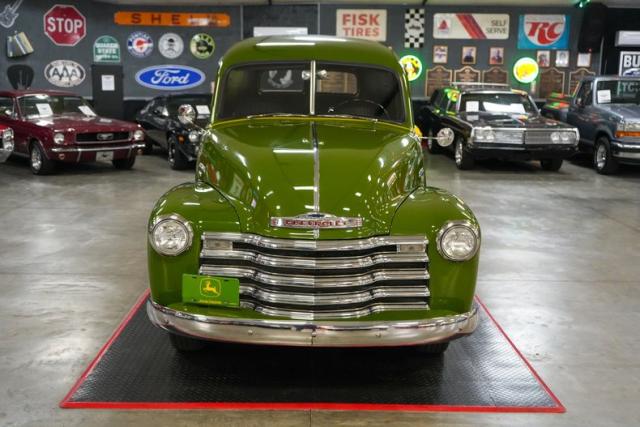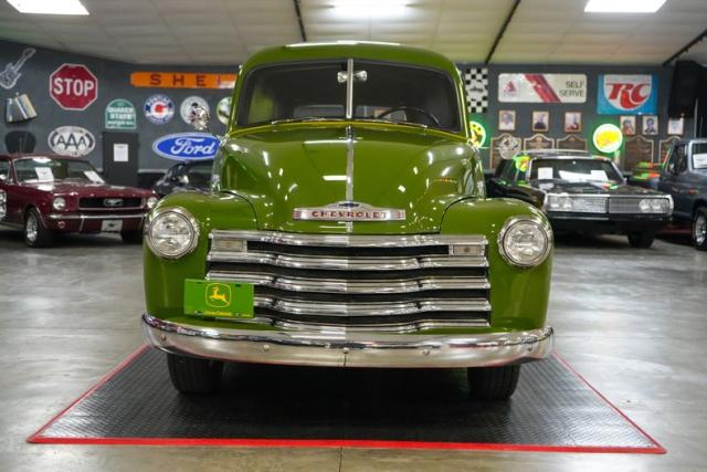 This 1950 Chevrolet 3100 Panel Truck is a classic workhorse powered by the reliable 216 Thriftmaster Stovebolt Inline 6 paired with a 4-speed manual transmission and 4.11 gears for vintage driving character. Finished in green with removable vinyl lettering, it offers flexibility for personal or business use. The black vinyl interior keeps things simple and functional, while 16-inch steel wheels with chrome hubcaps and wide whitewall tires complete the period-correct look. Featuring an updated 12-volt ignition system for improved reliability, this panel truck maintains its original charm with OEM-style components throughout, making it a unique and practical vintage cruiser.