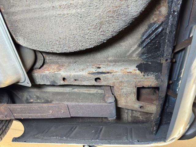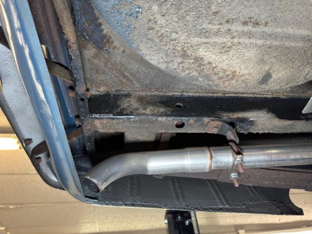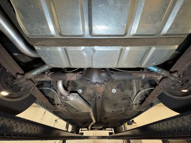 A pair of torsion bars in the front courtesy of a 340ci V8 powered Dart plus an added front sway bar along with factory rear leaf springs provide a smooth, comfortable and sure footed ride. Single exhaust in like new condition snakes its way back through a stock style muffler and keeps things nice and quiet. There\'s some typical surface rust on uncoated components, some residual oil on the pan, and some grease build up on the knuckles and in other spots, but otherwise the underside is free of invasive rust.