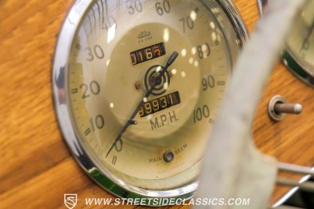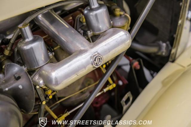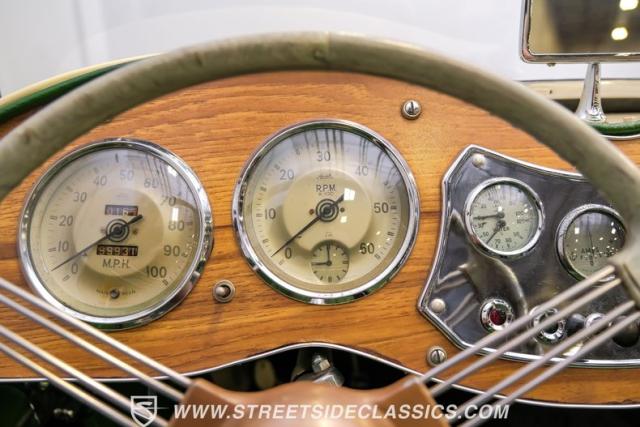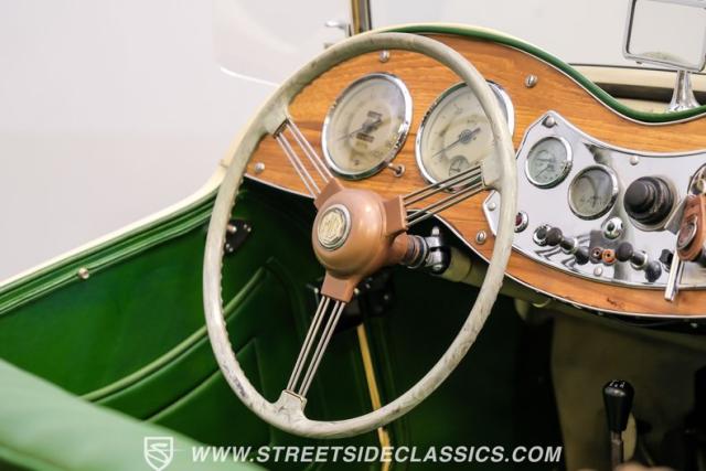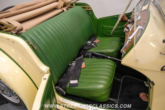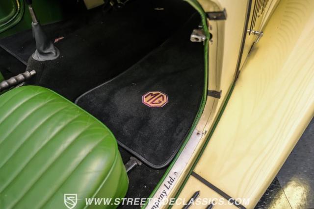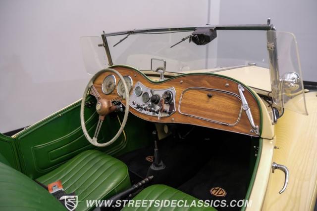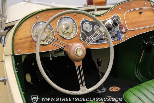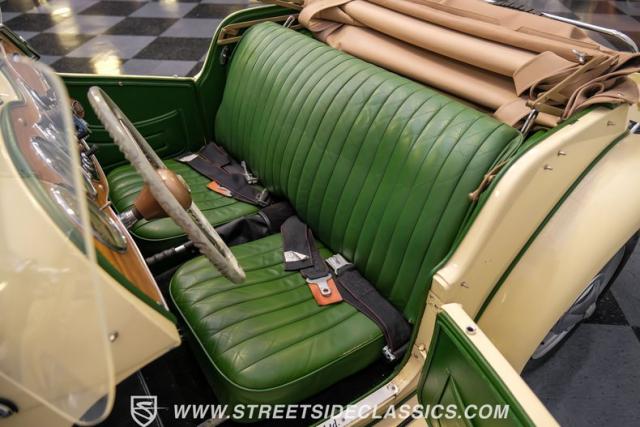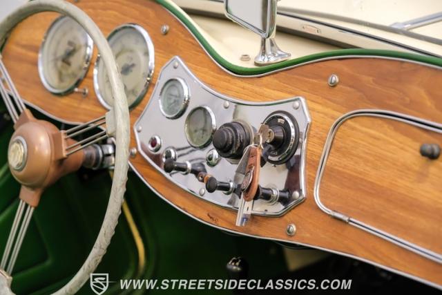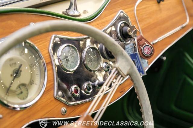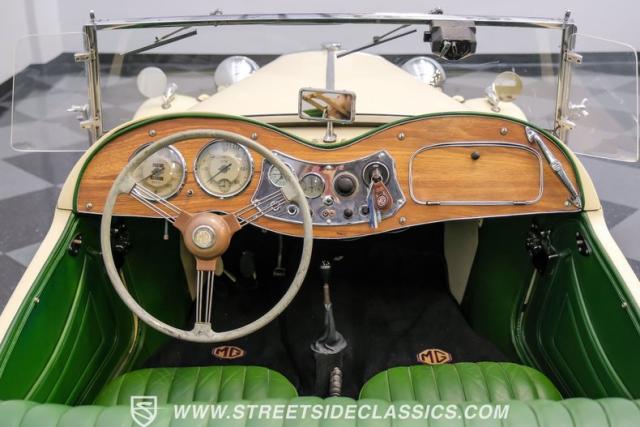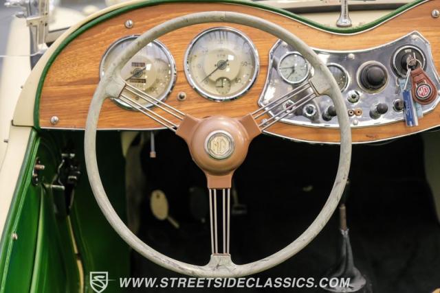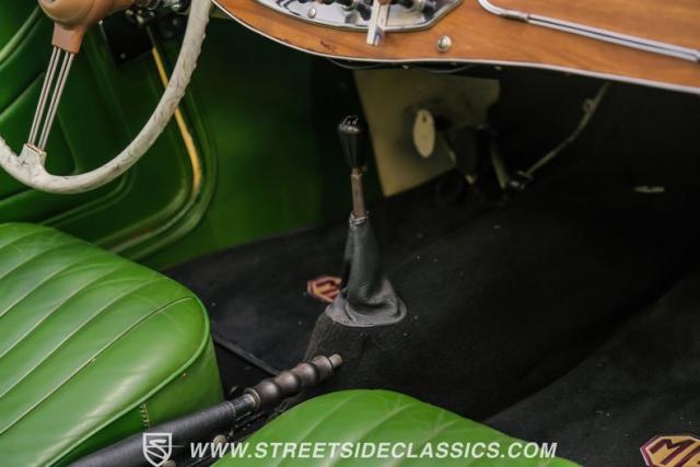 Inside, the green leather bucket seats and floor shifter invite you to partake in the visceral driving experience only a classic can offer. The dash, a real wood masterpiece housing Jaeger gauges, stands as a testament to craftsmanship and the era\'s luxury. Despite showing light signs of use, the interior remains a well-preserved capsule of automotive history. Every turn of the wheel and shift of the gears in this MG TD offers a tactile connection to a bygone era, free of power steering and air conditioning, focusing solely on the pure, unadulterated joy of driving.