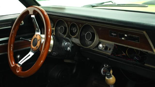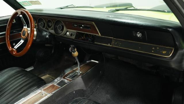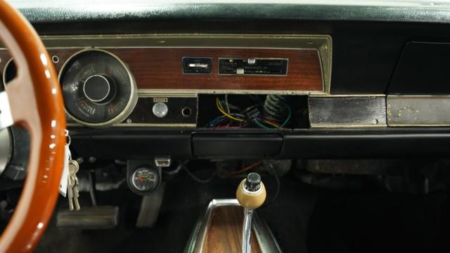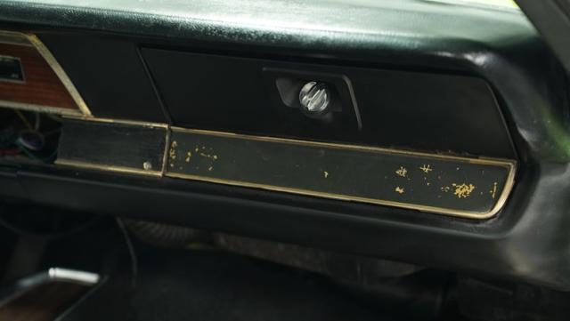 Opening the door reveals a classic black Mopar interior where bucket seats with a console setup invite you to take control. The cleanliness of the headliner and the maintenance of the door panels reflect a cared-for cabin, while the straightforward dash setup remains true to the car\'s vintage roots. The console shifter lies at the heart of the interior, reinforcing the car\'s sporty character, ready to engage with every shift.