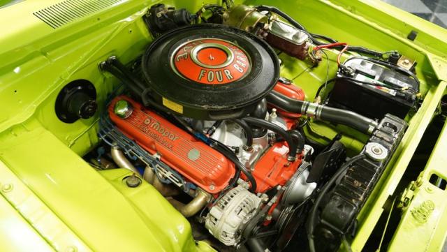 The engine bay houses a vigorous 340 V8 engine linked to a 3-speed A727 Torqueflite automatic transmission, offering smooth transitions and energetic responses. The setup includes power steering, enhancing maneuverability and ease of handling. Enhanced with a Holley carburetor and Weiand aluminum intake manifold, the engine displays both performance and visual appeal with Mopar Performance finned aluminum valve covers.