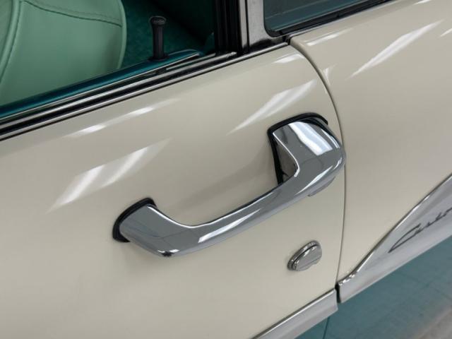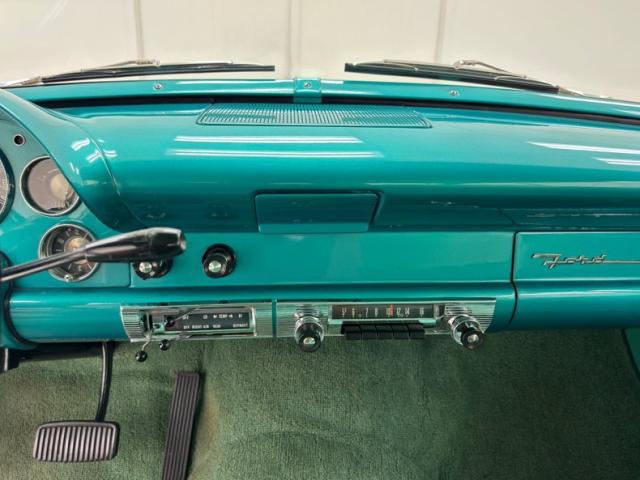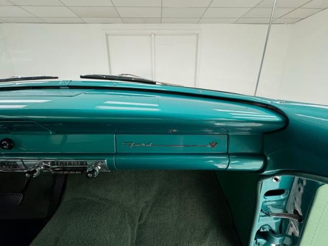 Two tone was trending at the time and we\'re all better off for it! This car wears a two stage coat of Berkshire Green over Colonial white. The blue green tone sandwiches the white that runs along a body trim piece that extends nose to tail with a fantastic triangle nameplate midway that creates a barbed spear below. Thunderbird taillights look like cat eyes over the Cheshire smile of the long, perfectly chromed bumper. Chrome is the highlight of the front as well with a stylish grille that is not over the top, chrome casing on the marker lights, and bumperettes on the bumper, all in fine condition. The hood ornament is polished to a perfect shine and so is the remaining brightwork on the car including the window frames. The Ford crests on the front, back, and hubcaps are fantastic and so is the paint which is miles deep on the green coverage and silky smooth on the white. We could not find anyglaring exterior flaws on this showpiece.
