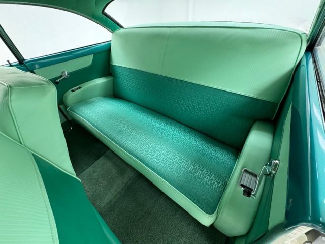 A body keyed header tops the door panels composed of 50\'s style contours of light green and dark green, patterns which are picked up near seamlessly by the back seat sidewalls. Vinyl topped upper in light green vinyl is over a darker green cloth with a marble pattern on the split bench and repeated with perfection on the rear bench which has constructed armrests with built in ashtrays on each end. The body color seat shell in front melds with the dash of the same color, fronted by a black plastic steering wheel with metal horn ring. Under the arch of the dash are simple gauges and a large speedometer, then the dash sweeps flatly right, glossy Berkshire green housing an AM radio and a vent controls. A new shade of green is introduced by the loop carpet on the floor which on the driver\'s side reveals perhaps the only imperfection on the interior, a bit of discoloration. The minty green headliner with its regal patterning, is about as good as it gets. The trunk is lined with a plaid mat and holds a spare white wall tire and painted tire case.