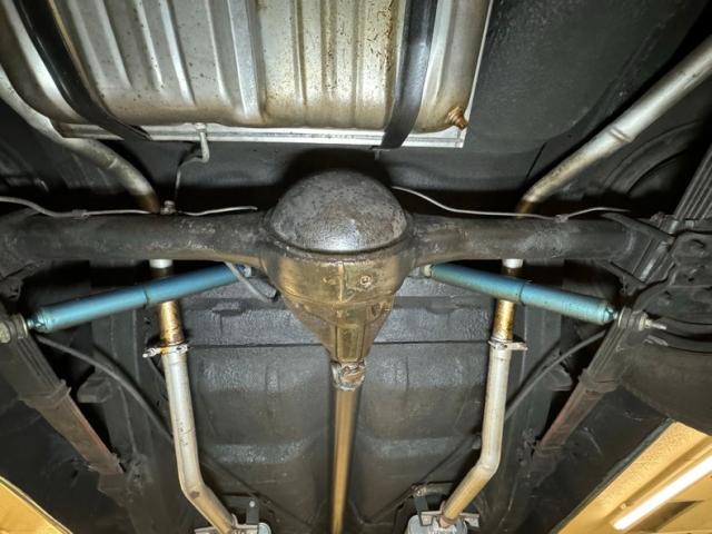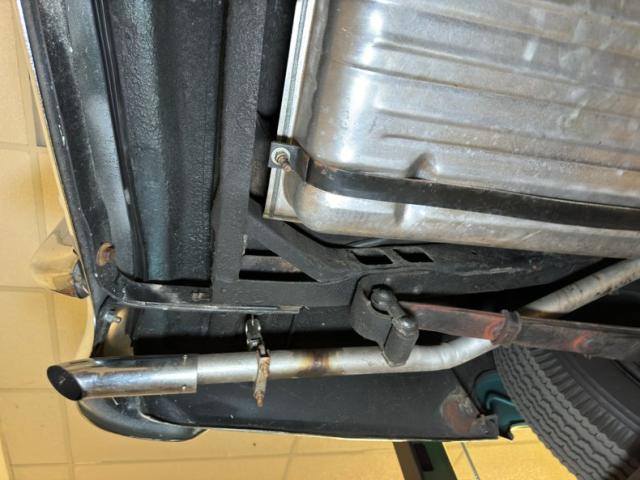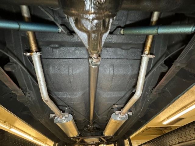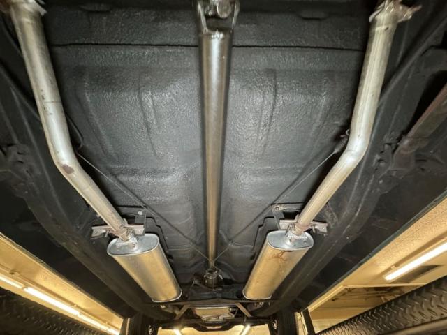 It\'s rare when a car is this clean on the top side that the underside doesn\'t reflect some care. And this one keeps with the trend as it\'s super clean with barely any surface rust and no errant fluids to speak of. If we had to find fault, there\'s a bit of grease build up on the steering knuckles but probably not enough to cause lost points in a judged show. Meanwhile, the clean dual exhaust joins with stock style mufflers before finding its way out the back, under the bumper via chrome tips. Suspension consists of coil springs in front and leaf springs in back.