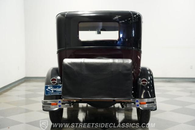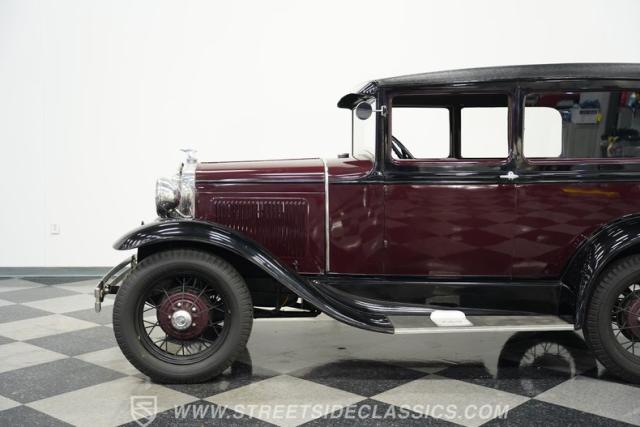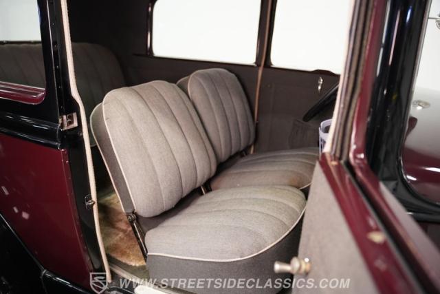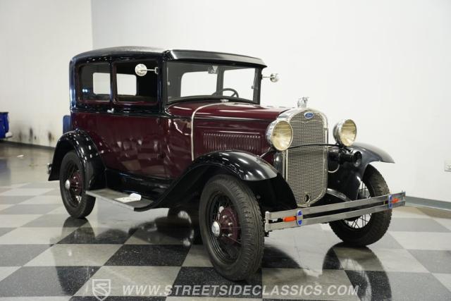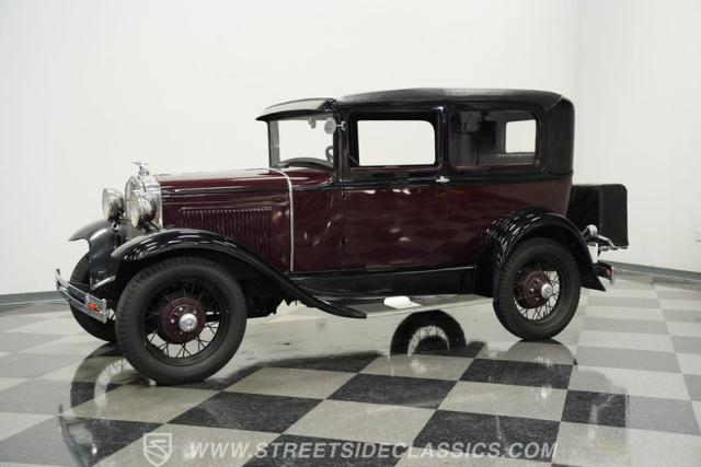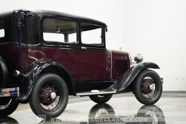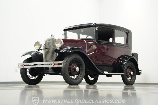 This 1931 Ford Model A Tudor Sedan is a genuine piece of automotive heritage. Its burgundy and black exterior gleams with a hint of nostalgia, showcasing the iconic Model A silhouette that defined an era. Rolling on black and burgundy 19-inch wheels wrapped in 4.75/5.00-19 tires, this classic maintains its original stance and road presence. The accessory grill guard, Quail radiator cap and trunk rack with removable trunk add to the appeal of this handsome Model A. Small turn signal lights have been added for safety.
