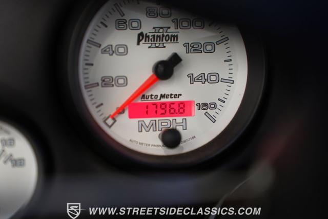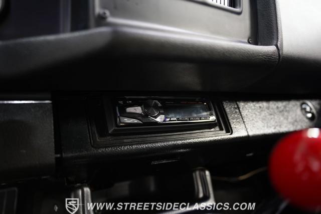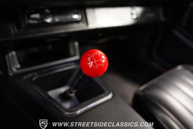 Inside, the black vinyl interior exudes classic muscle car cool. White-faced gauges contrast modernly against the dark dashboard, while bucket seats offer both comfort and support for spirited driving. The floor-mounted shifter for the 4-speed manual transmission sits ready for action, flanked by a functional center console. An upgraded AM/FM CD player with Bluetooth and aux/USB capabilities to add a soundtrack to your drive.