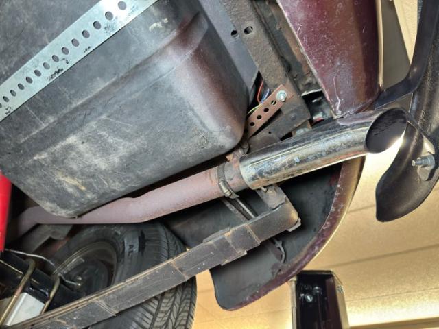 We find an X-frame and generally clean components underneath and also a good amount of swiss cheese on the inner rocker panels. Beyond that, very little surface rust and no errant fluids. Dual exhaust flows through Smithy mufflers, exiting via chrome tips behind the rear bumper. Power disc brakes are up front with power drums in back and suspension consists of coil springs in front and leaf springs in back.