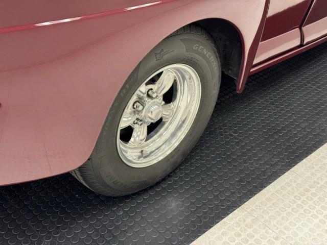 Smartly designed tan door vinyl door panels include electric windows and a cloth insert that connects visually with the split bench seat up front and all appears in nice shape with a rear bench that has ample leg room and smooth sidewalls. Up front, things are color coordinated with the body, including the 3 spoke steering wheel and complete dash housing the billet faced gauge cluster with VDO units. Under the clean panels of the dash expanse is an AM/FM/CD radio with AUX/USB/Bluetooth. A United Pacific style traffic light viewer is on top of the dash, showing some cracking but likely still functional and helpful in a car with narrow windshield. Tan carpet covers the floor and footwells nicely and the black headliner is clean and fully intact. The big trunk is uniformly black and also clean.