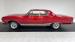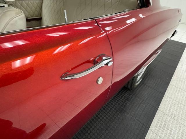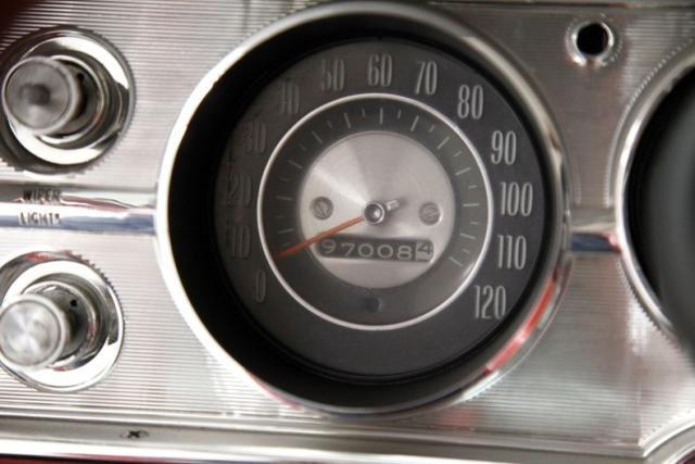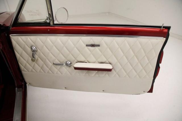 A swing of the doors and we greet custom styling with a diamond pleated white vinyl panel with metallic red steel above and smooth white vinyl below. This panel has the door actuators and window cranks as well as a white vinyl covered pull/armrest. Inside we see later model white vinyl high back bucket seats with more diamond tuck and roll pleating and smooth bolsters. Red carpeting surrounds the seats and from the middle of the hump a Hurst shift grows within the driver\'s reach. In back is a white vinyl bench with front seat matching diamond tuck and roll with some armrests built into the sides. More heavy red metallic steel for the inverted V style aluminum which dash drips of 60\' bowtie styling. The original center gauge cluster, which is flanked by the speedo on wheel left, and a temp, oil, fuel and amp cluster to wheel right. An aftermarket tachometer is mounted to the column and shows between the 2 round gauges. Original pull knobs function perfectly, and a more modern styled radio is now replacing the original but appears to be slightly broken. Sitting on the top of the back seat are dual speakers. As I look around this clean red and white interior all I can hear is Bowie on the radio belting out Heros.