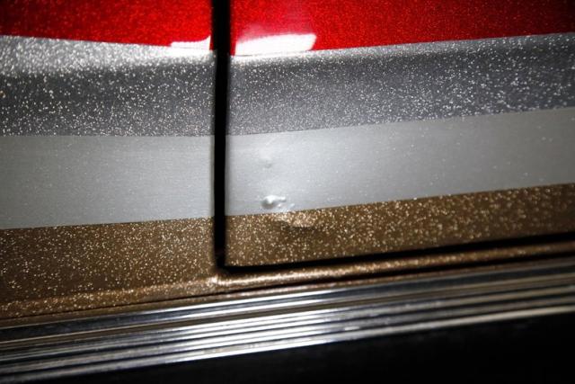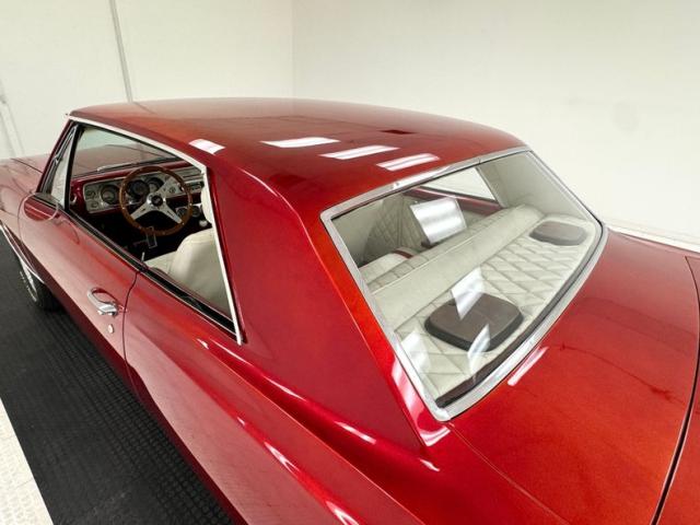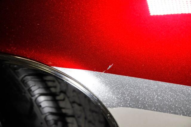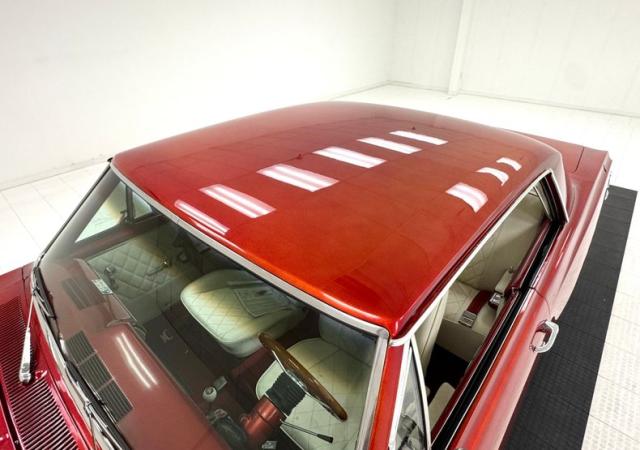 Painted with a heavy metallic red that under certain lighting shifts to a more orange hue and cannot be truly appreciated until seen in natural sunlight and is nothing like the factory ever offered. Some bubbling is noted on the exterior surfaces, and areas of previous repairs are slightly bumpy. A nicely restored horizontal ribbed grille with Chevy badge in the center has dual headlights and a shiny bumper below. As we work our way rearward, good gaps and britework are noted throughout along with more heavy metallic for the silver, gold and gray stripes on the lower body. This car is badged with the Chevrolet crossed flags and 283 designation, along with the Malibu SS badges on the rear quarters and lest we forget the frenched dual power antennas on the rear quarters. 15-inch chrome 5 spoke Cragar wheels are on all 4 corners and are wrapped with almost new 235/60R15\'s all around.